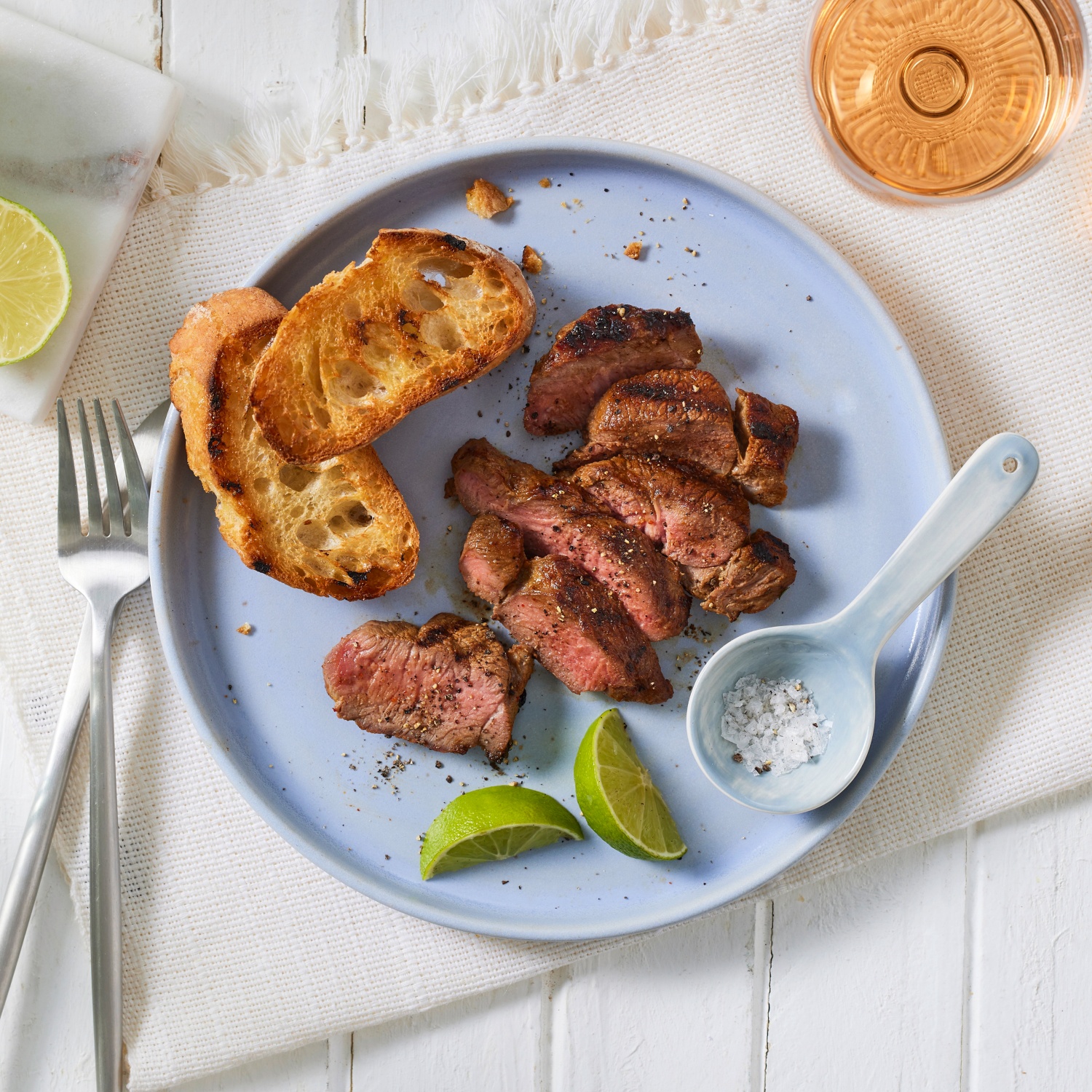 Die Baguettescheiben ebenfalls kurz auf den Grill legen. Servieren Sie die Steaks mit Limetten-Spalten und gegrilltem Brot.