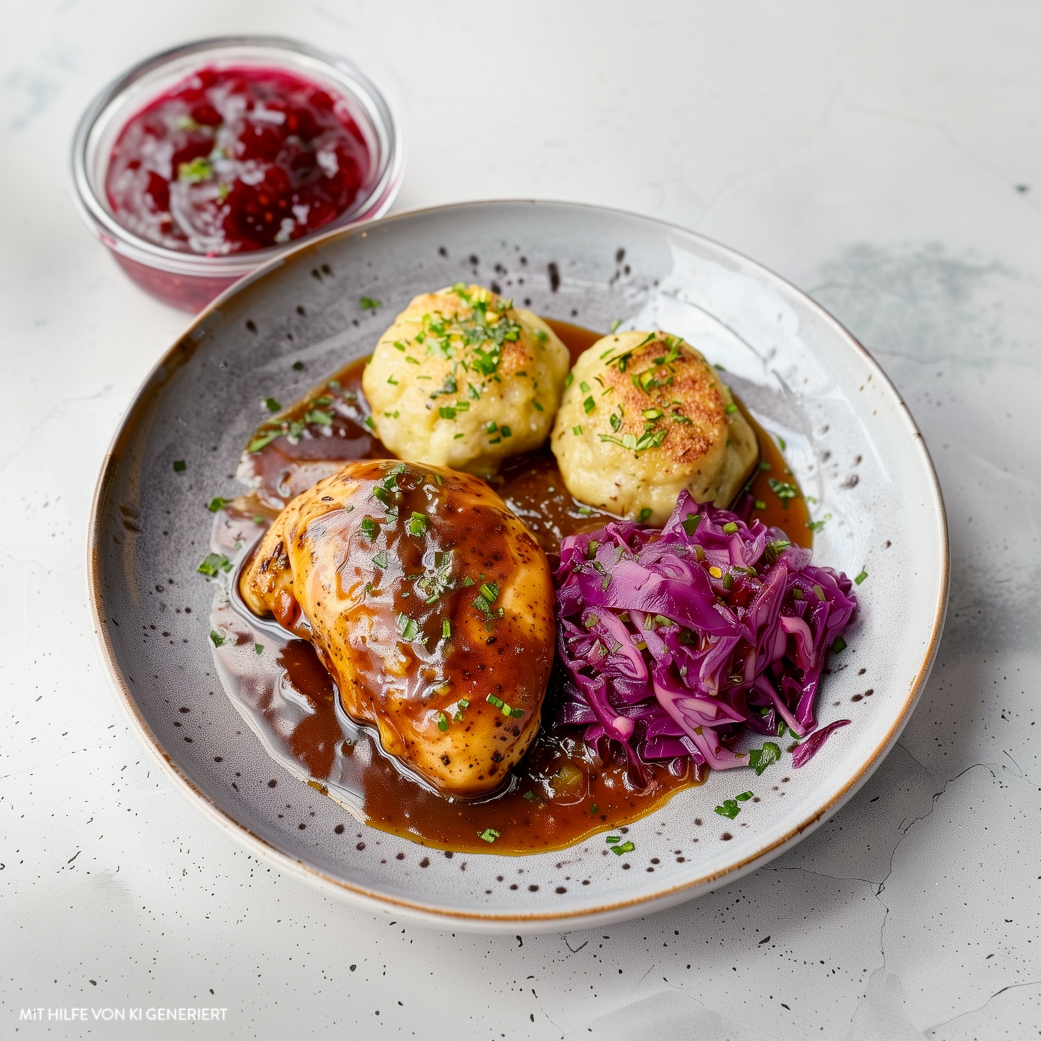 - Das Hähnchen aus dem Ofen nehmen und zerlegen. Zusammen mit dem Rotkohl und Klößen auf den Tellern anrichten. Mit dem Preiselbeer-Kompott und nach Belieben mit frischen Kräutern garnieren und servieren.