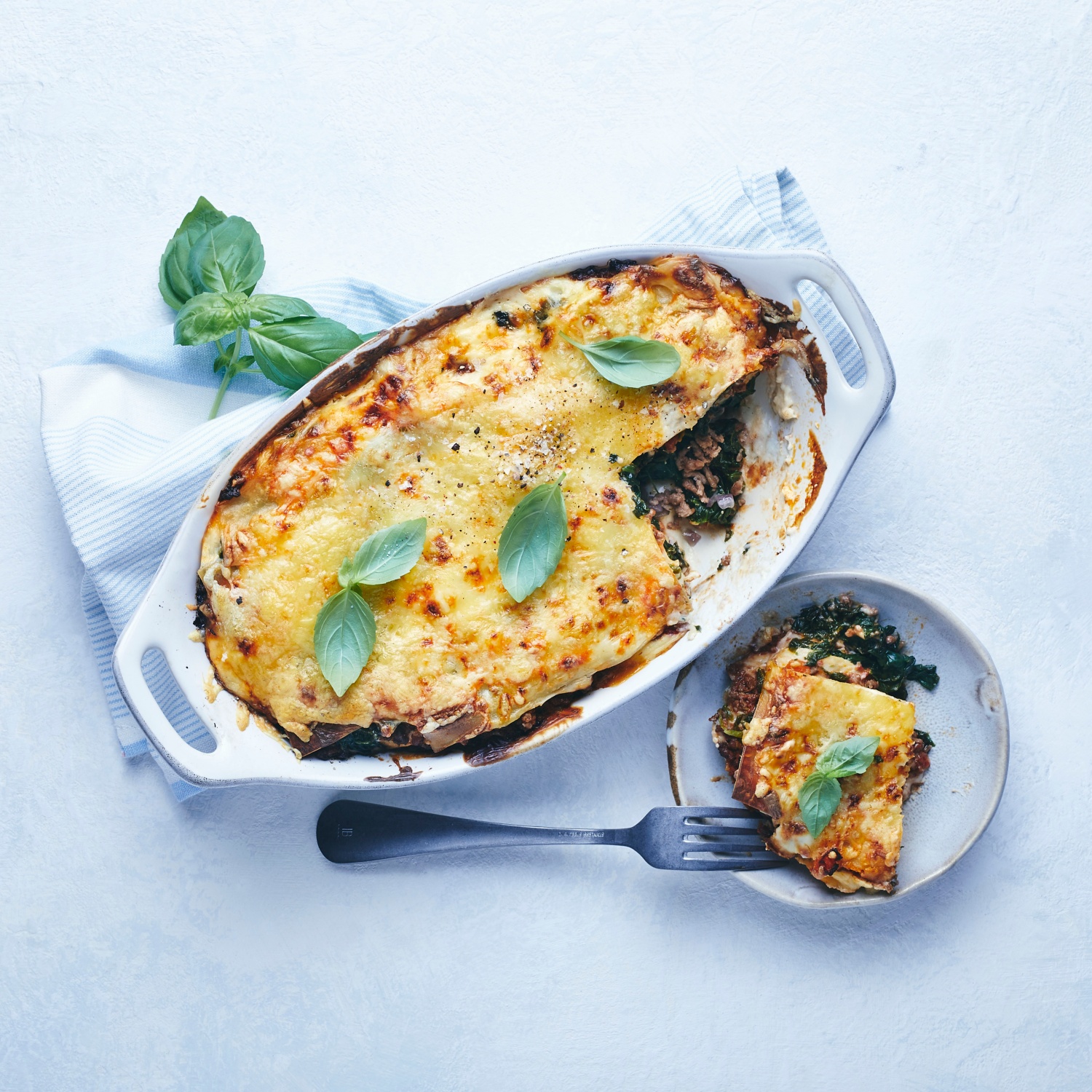 - Die Hälfte Spinat und dann die Hälfte der Bolognese darauf verteilen. Mit 3 Lasagneblättern belegen, die Hälfte der übrigen Béchamelsauce, den restlichen Spinat und die übrige Bolognese darauf verteilen und mit Lasagneplatten abschließen.