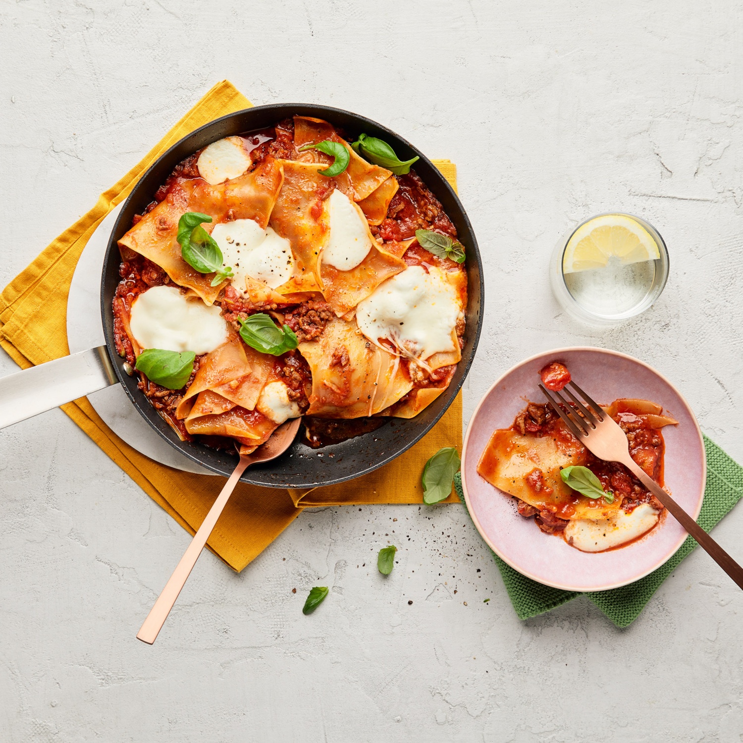 Schnell gemachte Lasagne? Das geht super in der Pfanne! Probiere unser Rezept mit Hackfleisch und Tomaten. Zum Rezept