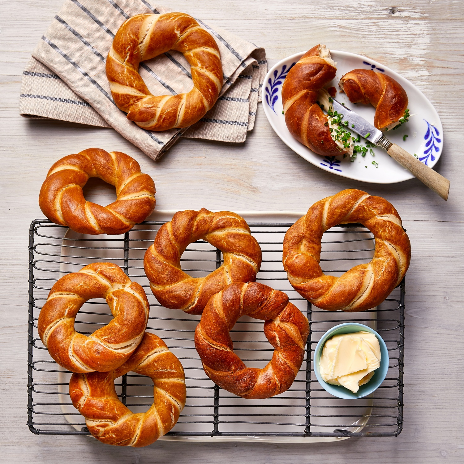 - Den Teig auf der bemehlten Arbeitsfläche in 12 Portionen teilen. Aus jeder Portion zwei etwa 27 cm lange Stränge rollen. Die beiden Stränge umeinander wickeln und zu einem Kreis schließen. Die 12 Kringel auf zwei mit Backpapier belegte Backbleche legen und zugedeckt 10 Minuten gehen lassen.