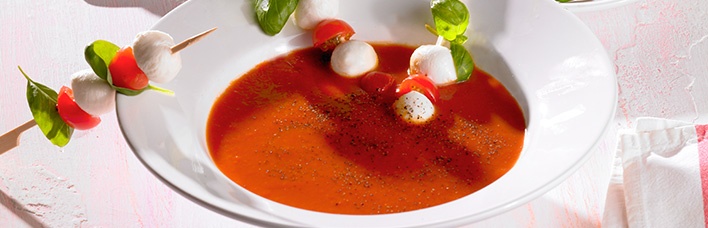 Leichte und unglaublich leckere Tomatensuppe ist in kurze Zeit fertig zum Genießen. Verfeinert mit Mini-Mozzarella, Kirchtomaten und Basilikum Spießen sieht sie Suppe großartig aus. Zum Rezept