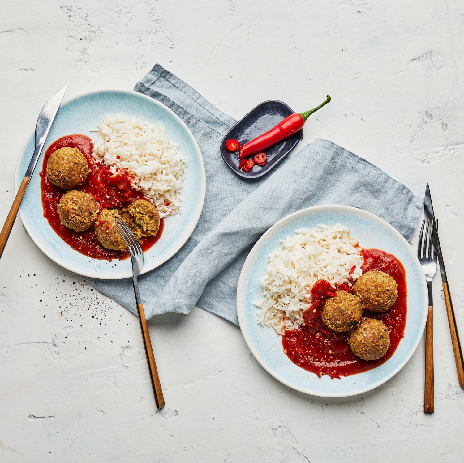 Nahrhaft und lecker: Die rote Chili-Tomatensauce gibt den Linsenbällchen den feurigen Kick. Der Reis harmoniert dazu perfekt. Zum Rezept