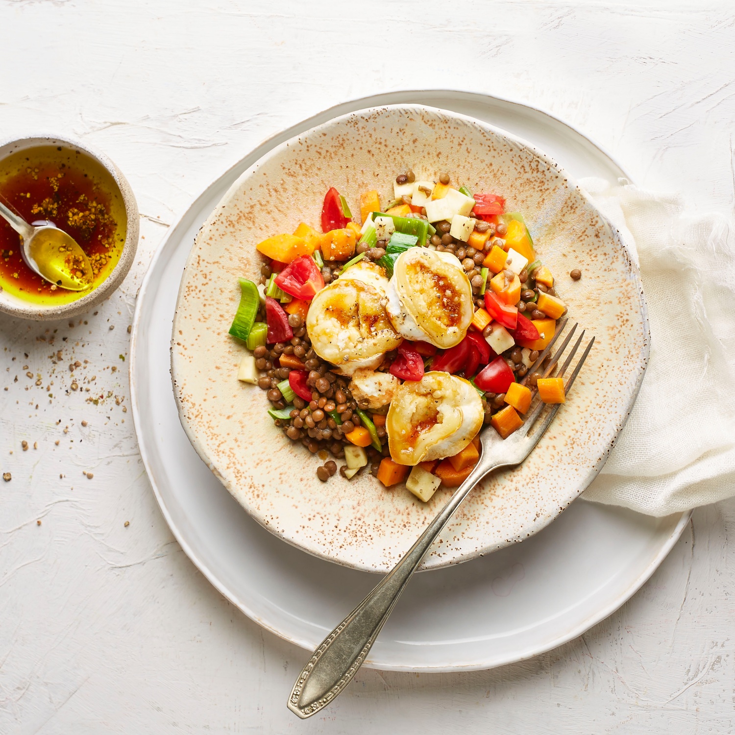 - Den Linsensalat zusammen mit dem Ziegenkäse anrichten und servieren.