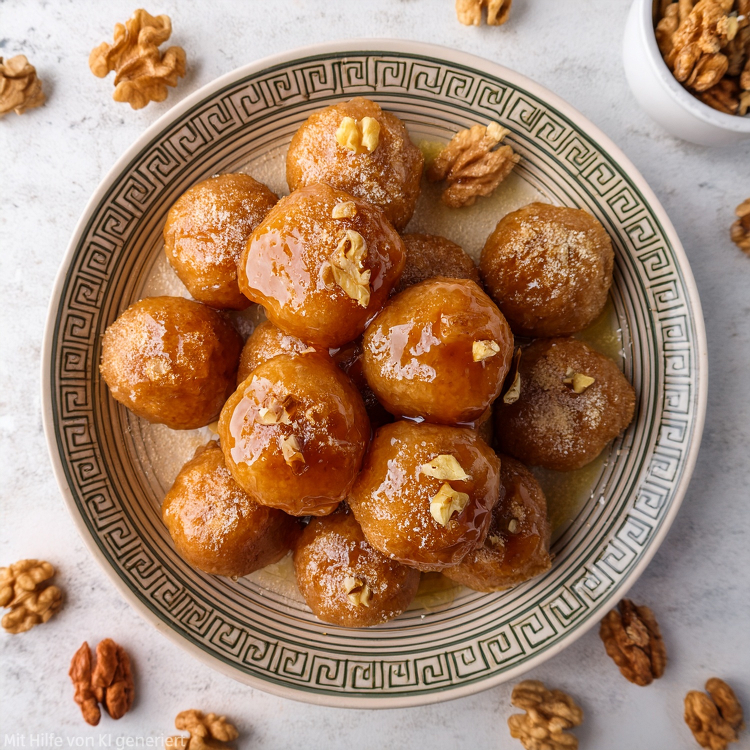 - Die gerösteten Walnüsse gleichmäßig über die Loukoumades streuen und wahlweise mit Zimt oder Puderzucker bestäuben.
