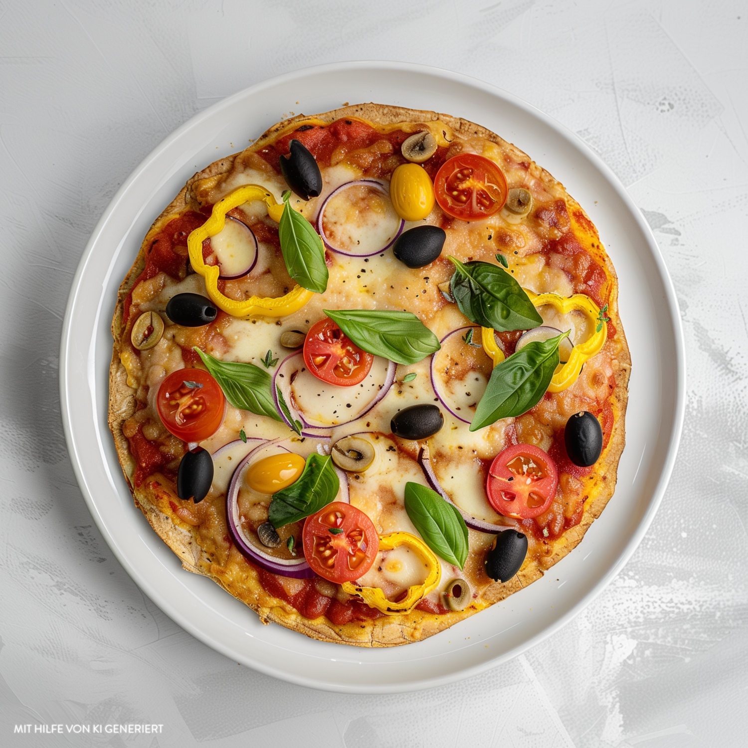 - Die vorgebackenen Böden mit der Tomatensauce bestreichen. Den Mozzarella in Scheiben schneiden und gleichmäßig auf die Pizzateige geben. Mit dem vorbereiteten Gemüse und den Oliven belegen.