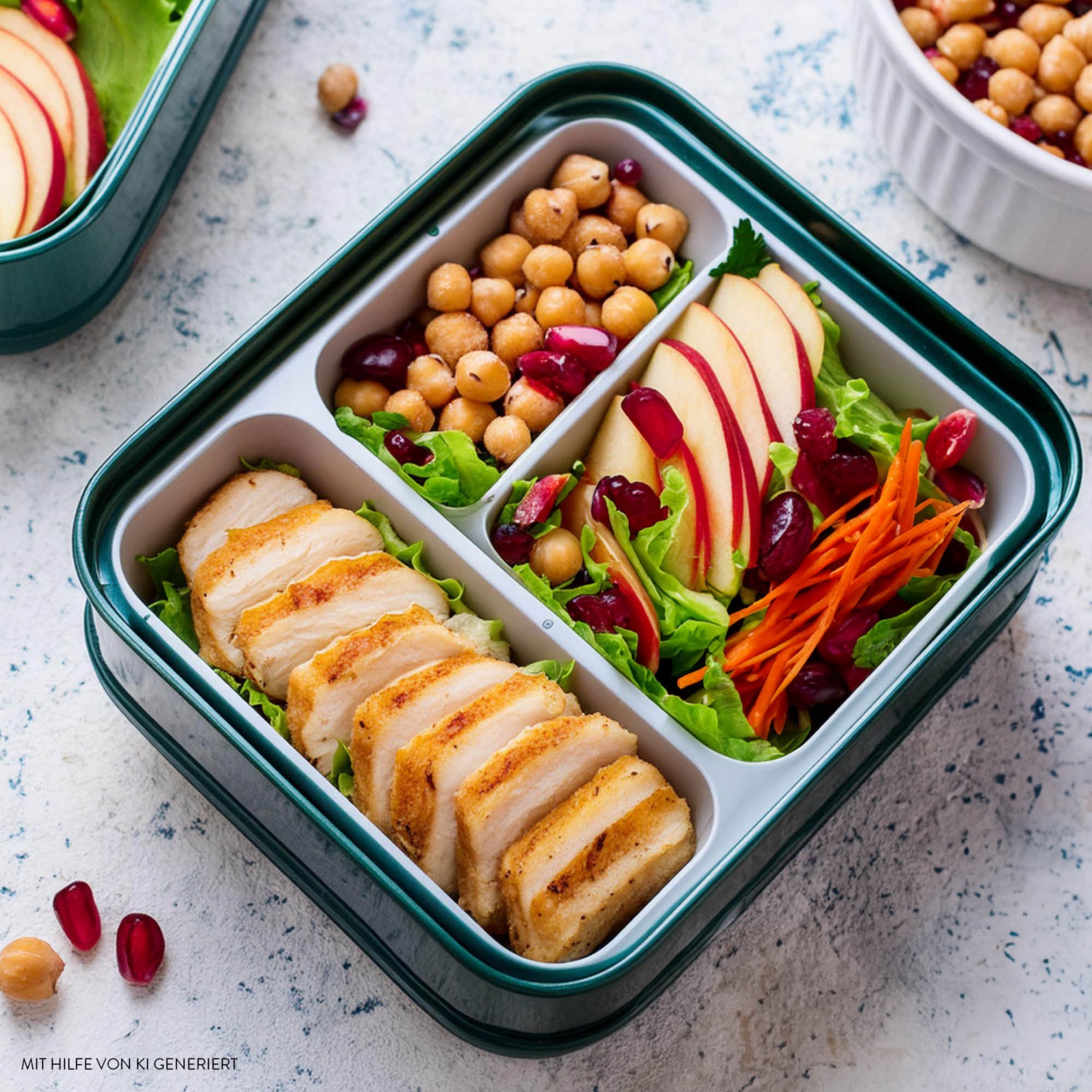 - Die Box mit der Hähnchenbrust, den Kichererbsen, dem Rohkostsalat und viel buntem Gemüse füllen.
