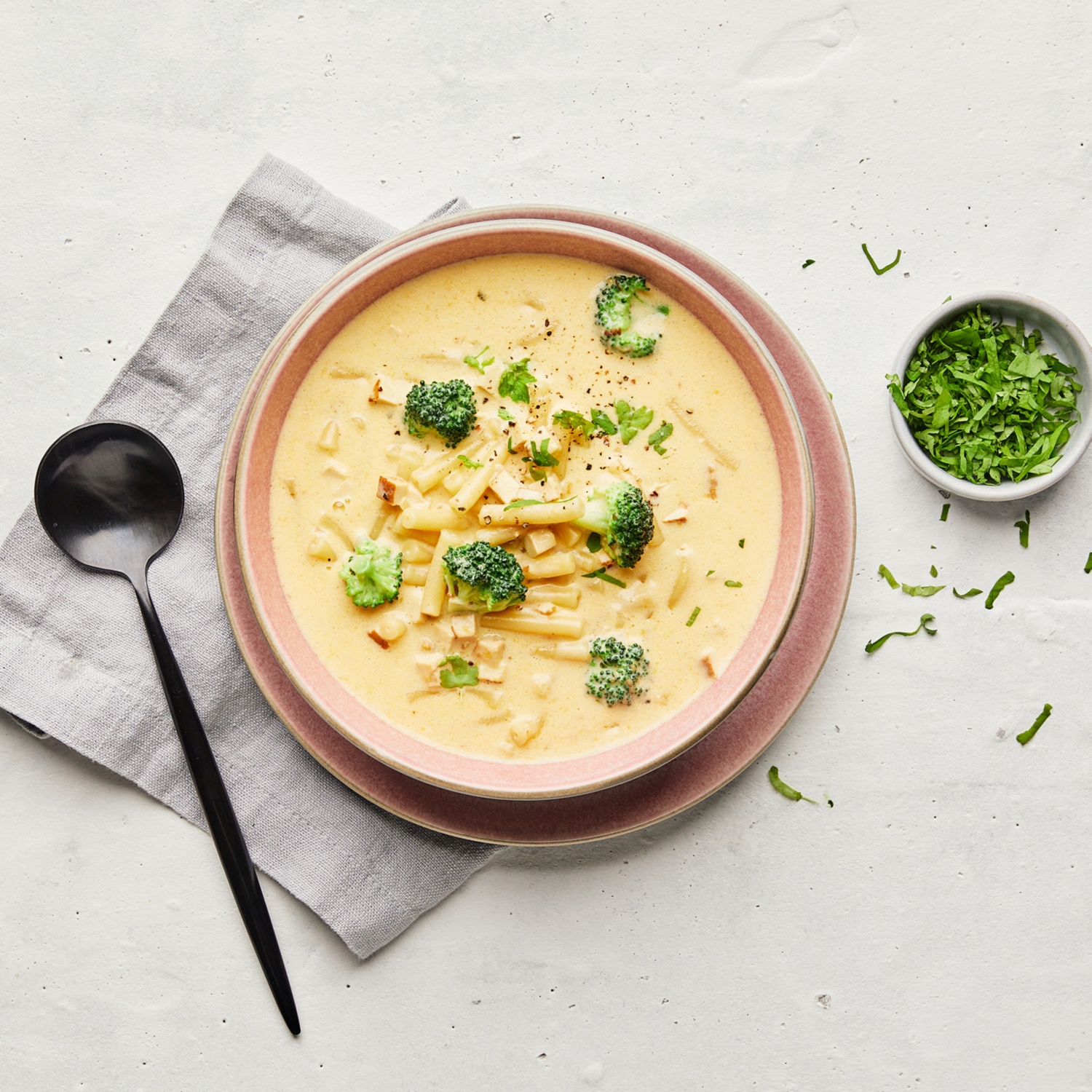 - Den Brokkoli untermischen und die Mac-and-Cheese-Suppe mit gehackter Petersilie garnieren und servieren.
