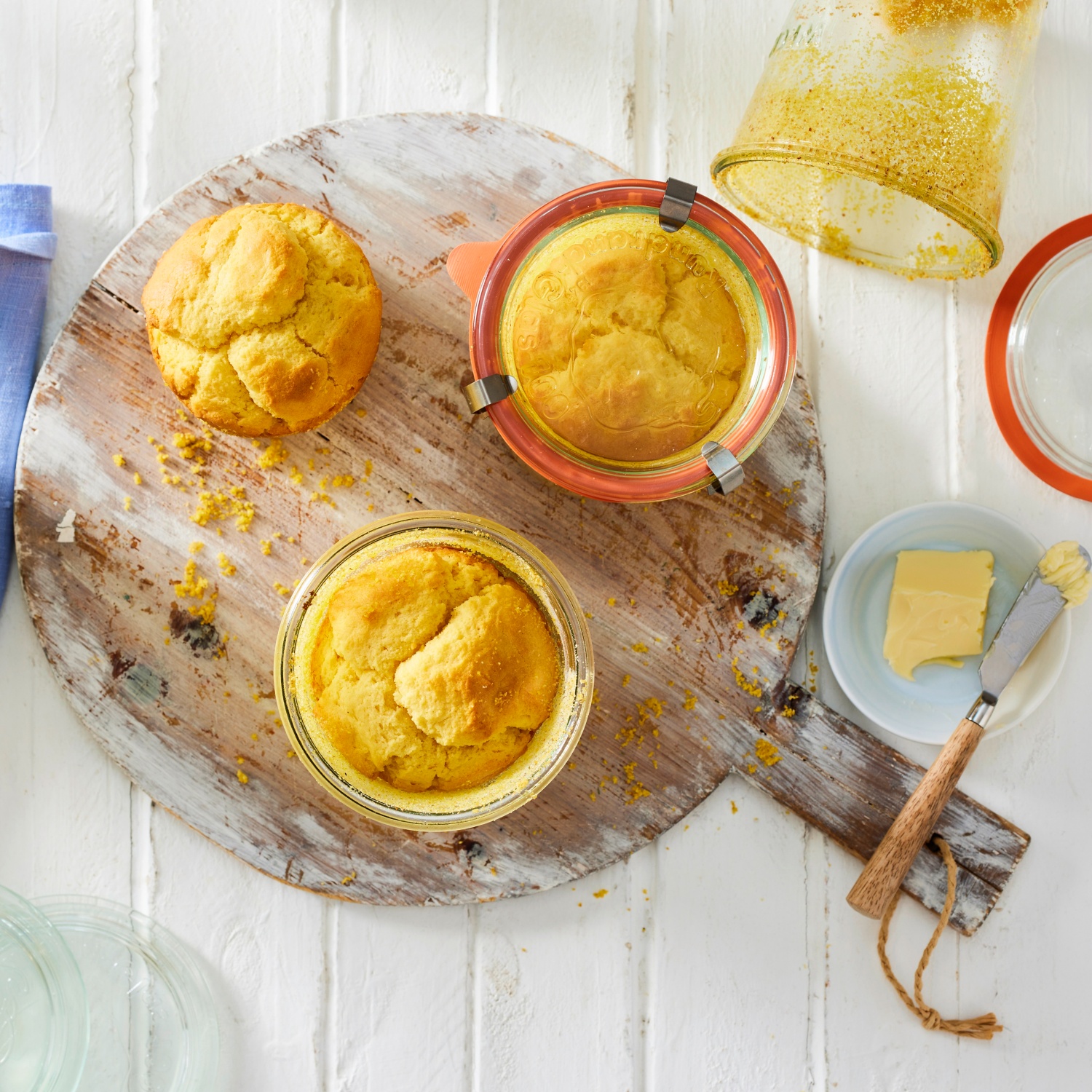 3. Fertiges Maisbrot im Weckglas aus dem Ofen nehmen, evtl. mit einem Gummiring und Deckel verschließen und auskühlen lassen. Dazu schmeckt Butter.