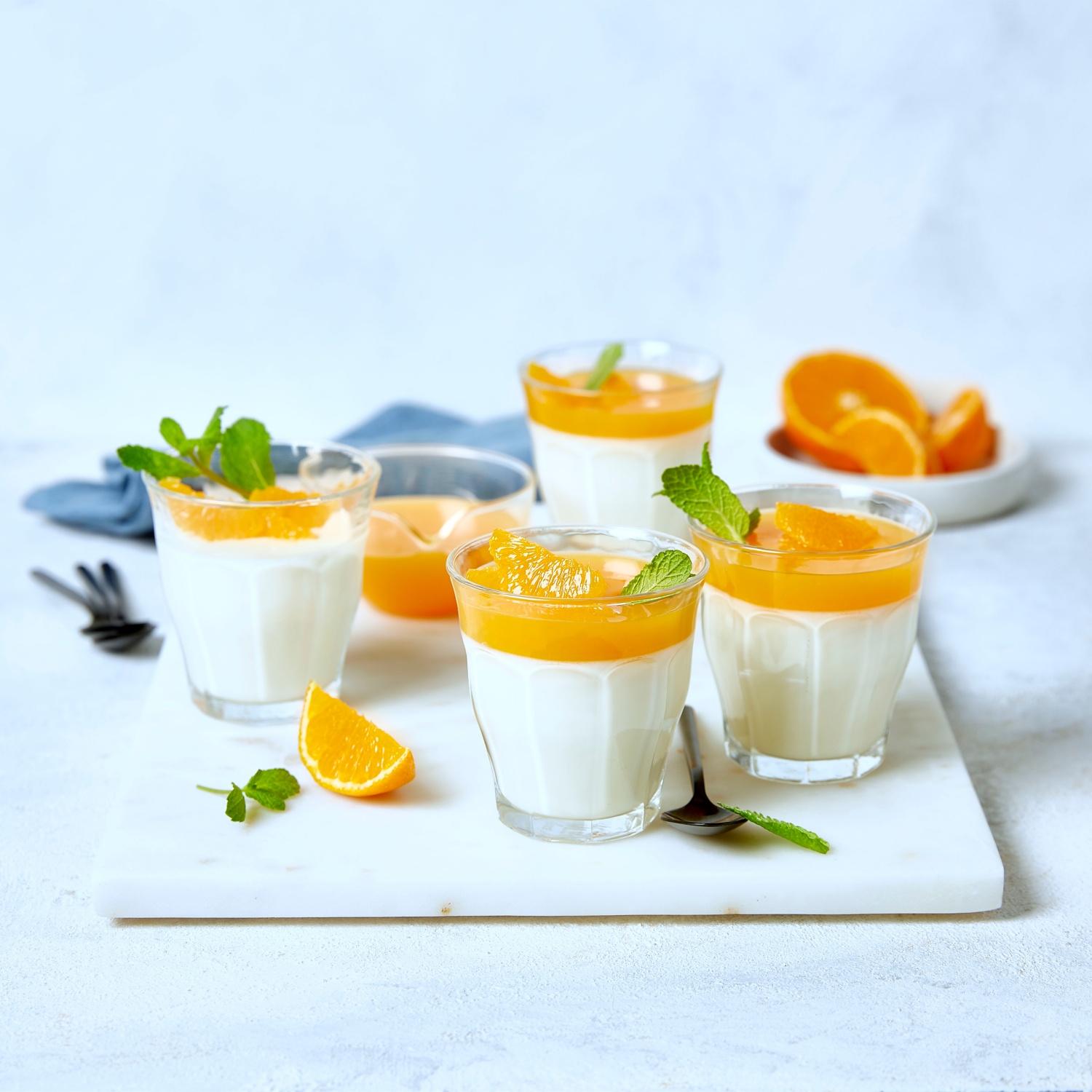 - Mandarinen mit einem Stabmixer pürieren und auf die Panna Cotta geben.