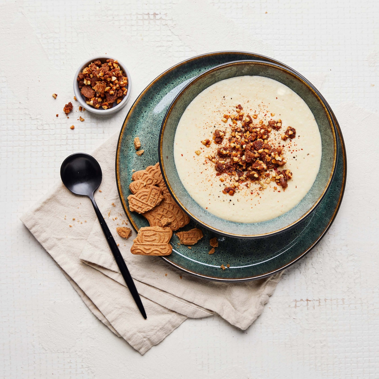 - Die Mandelsuppe mit dem Spekulatius-Crumble garnieren und servieren.
