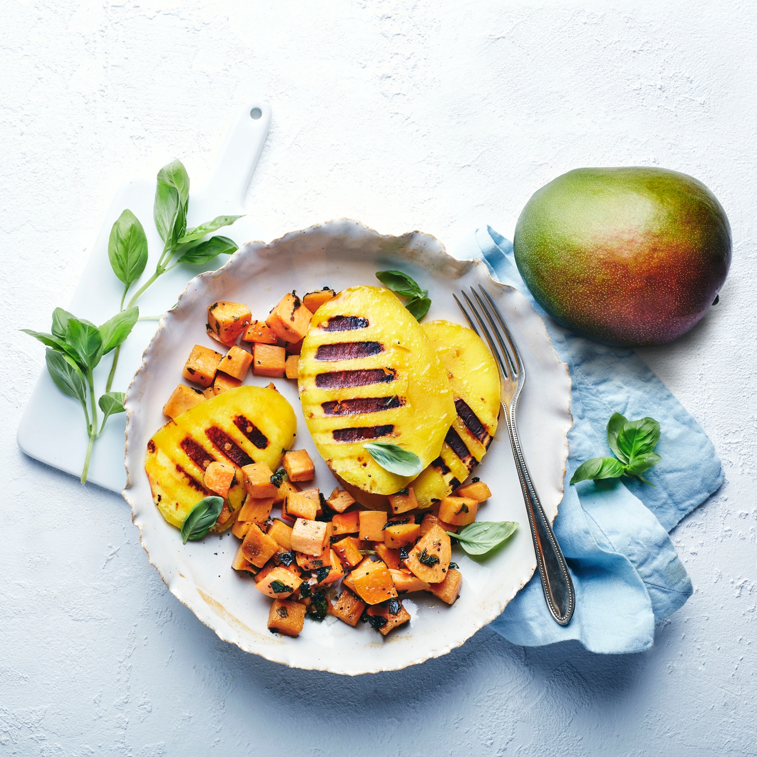 Dieses vegane Sommerrezept schmeckt leicht und bekömmlich. Die gebratenen Süßkartoffeln werden in Basilikumöl geschwenkt und mit der gegrillten Mango serviert. Zum Rezept