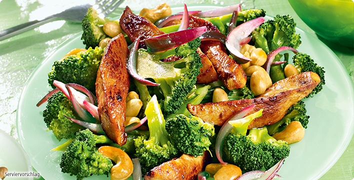 Marinierter Brokkoli mit Hähnchenstreifen und Nüssen