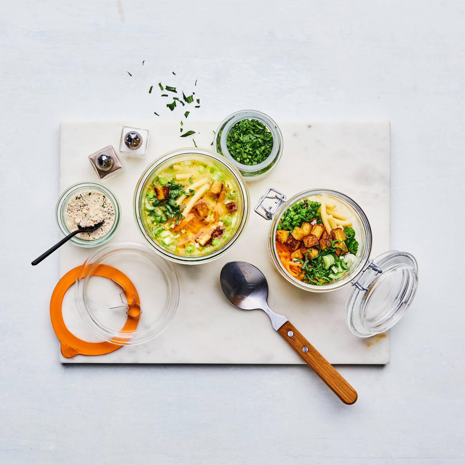 - In jedes Glas 1 TL Brühpulver geben. Die Nudeln, den Tofu, die Möhren, den Sellerie, die Zwiebeln und die Petersilie hineinschichten.