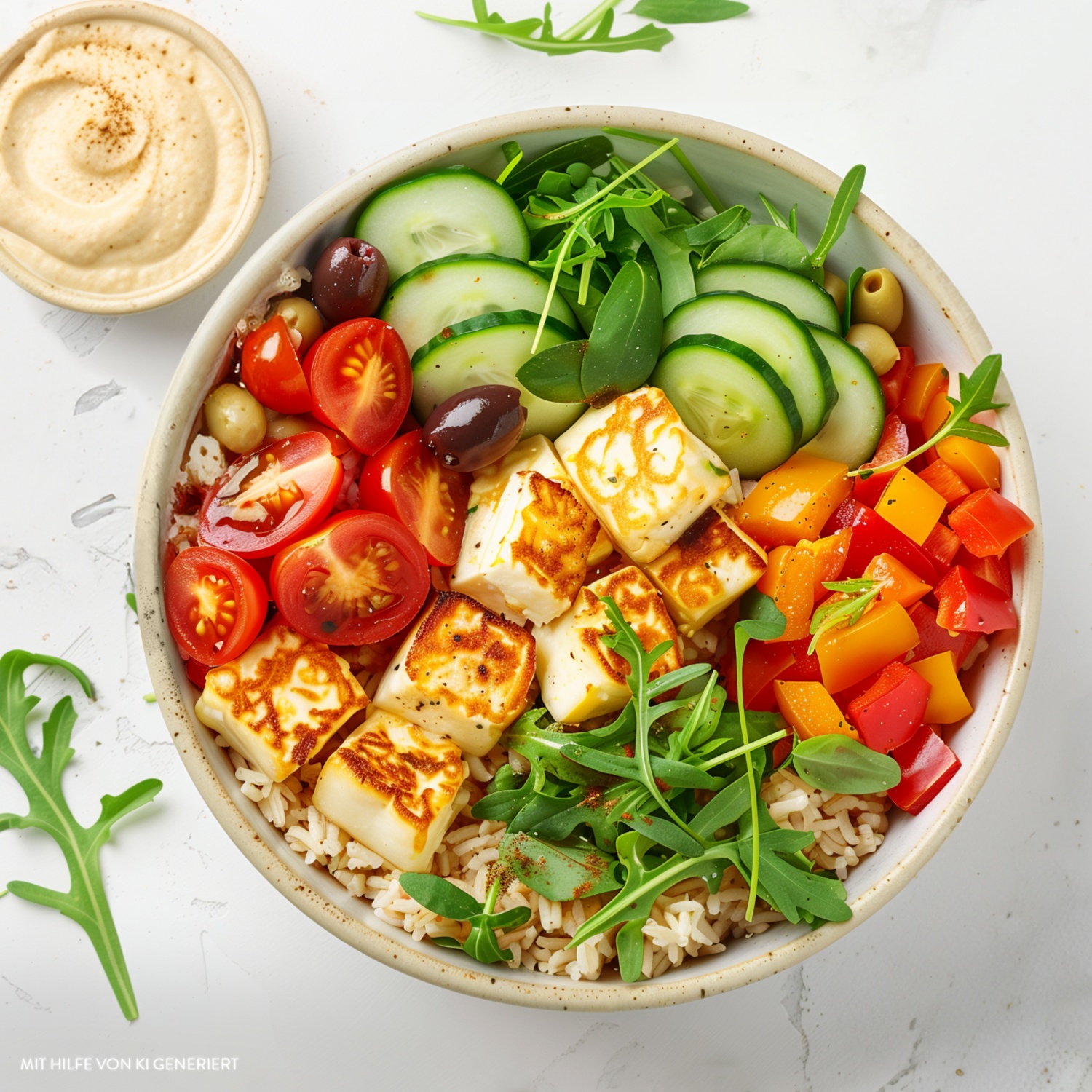 - Den abgekühlten Reis gleichmäßig in vier Schalen verteilen. Die angebratenen Halloumi-Würfel, Paprika, Gurken, Tomaten, Oliven und Rucola gleichmäßig auf die Schalen aufteilen und ansprechend anrichten.