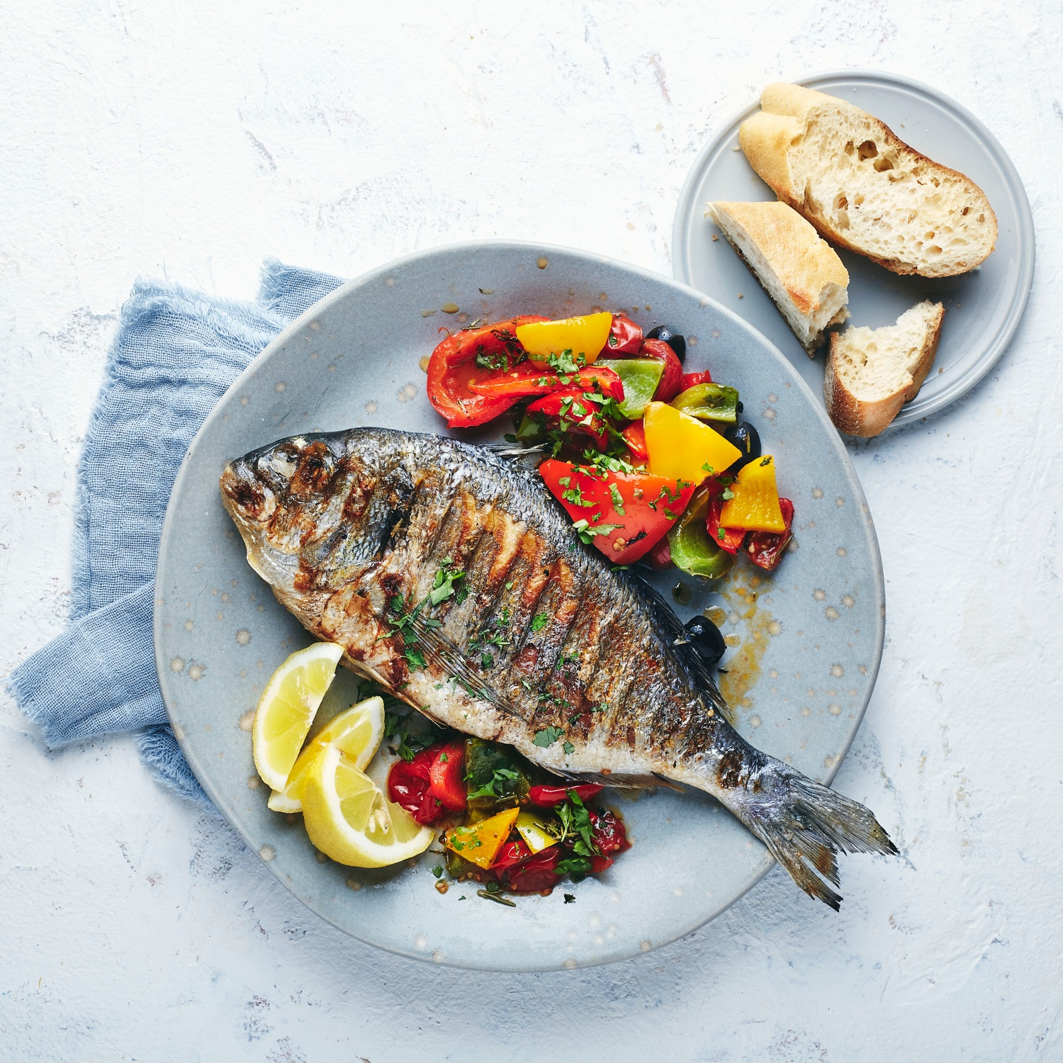- Die gegrillten Kräuter-Doraden mit dem Gemüse und den Zitronenecken servieren. Frisches Baguette dazu reichen.
