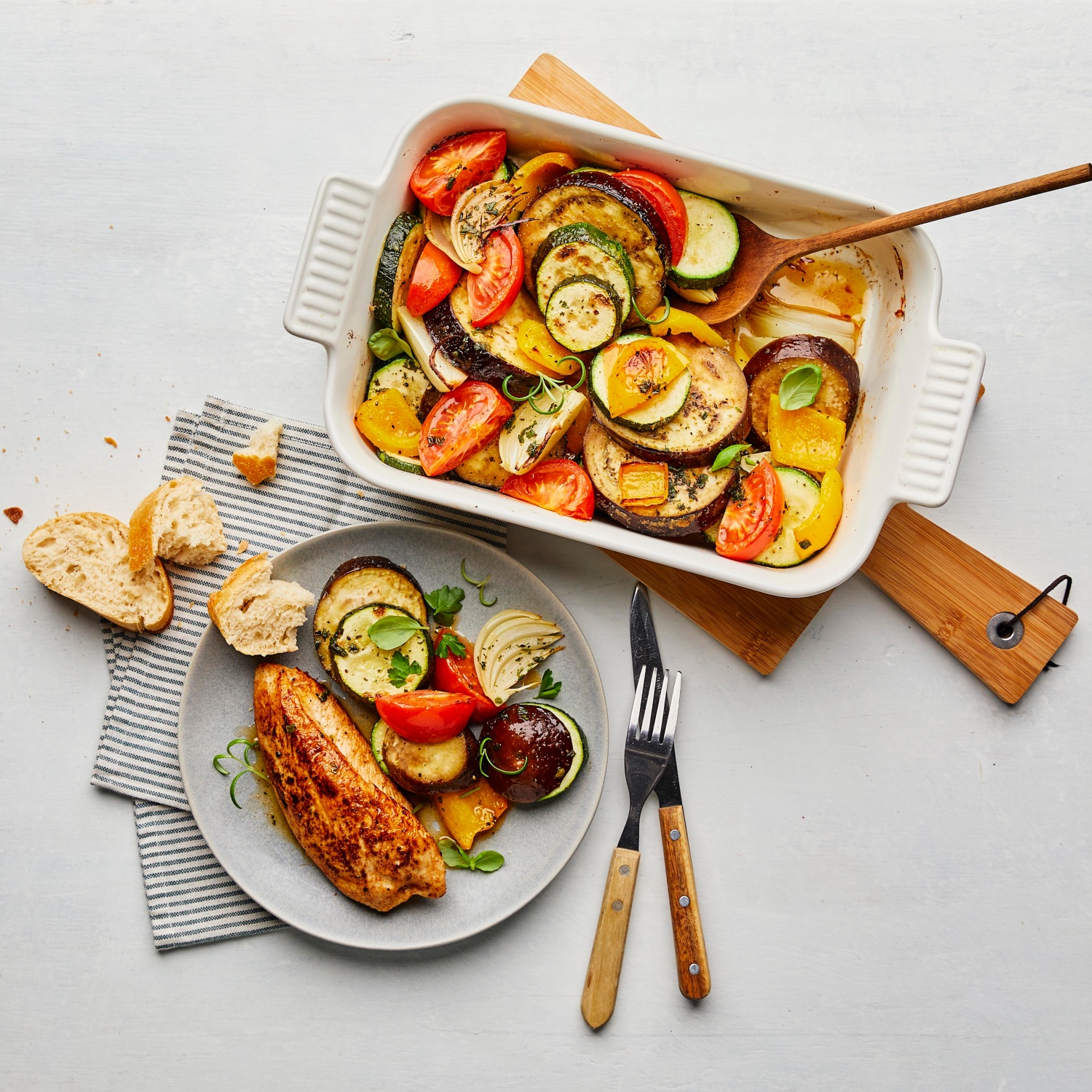 - Das mediterrane Ofengemüse mit den Putensteaks und etwas Ciabatta servieren.