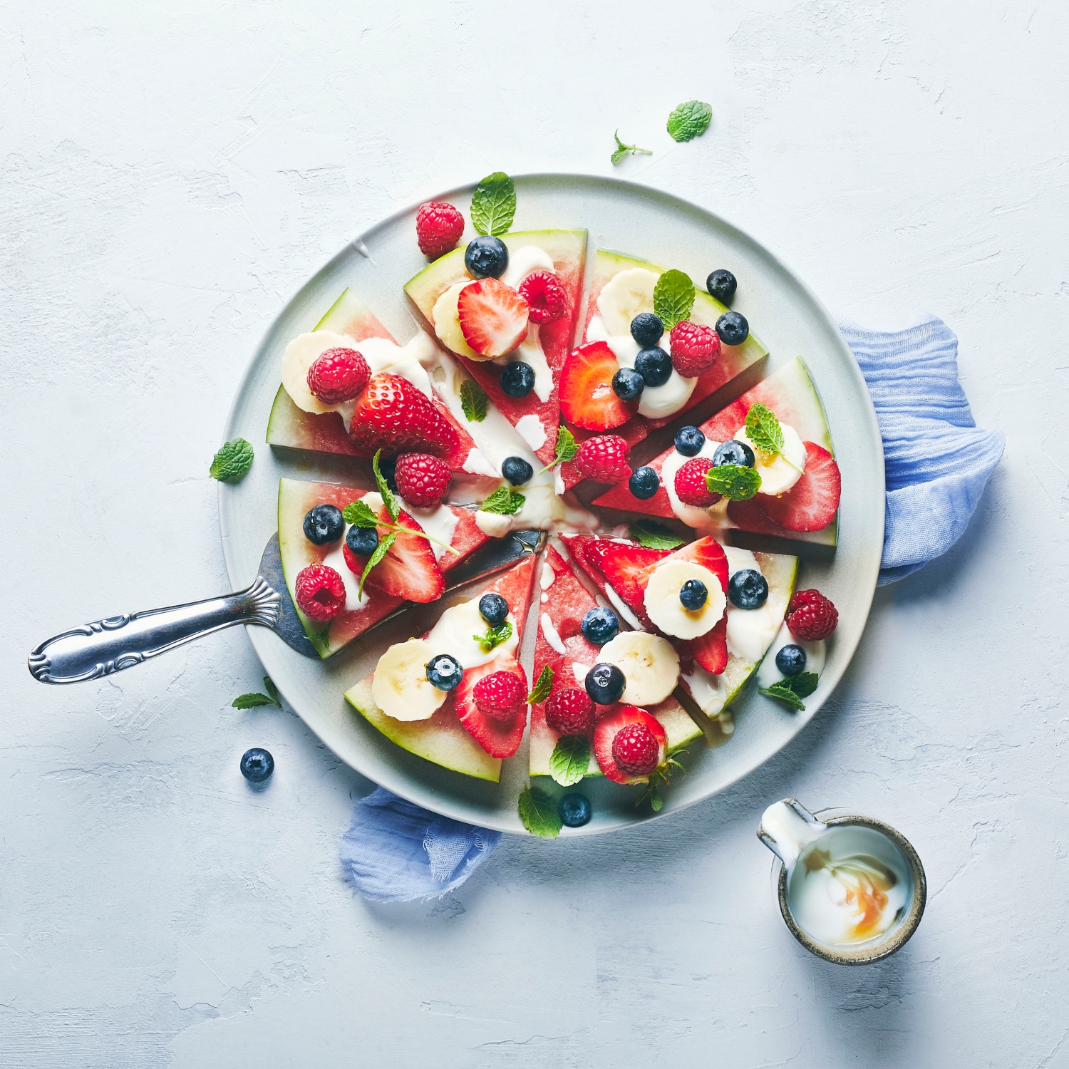 - Die Melonenpizza mit frischem Obst und Minze garnieren.