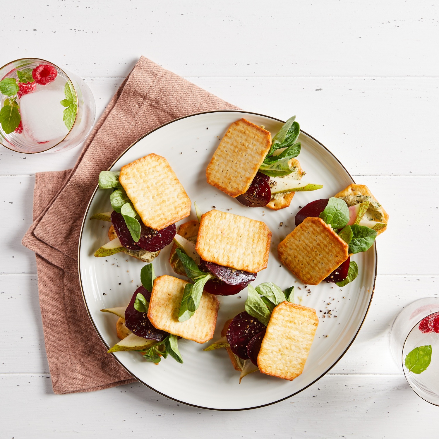 - 20 einzelne Mini-Cracker mit dem Cashewmus bestreichen und mit Birne, Rote Bete und Feldsalat belegen. Jeweils einen Cracker oben auflegen.