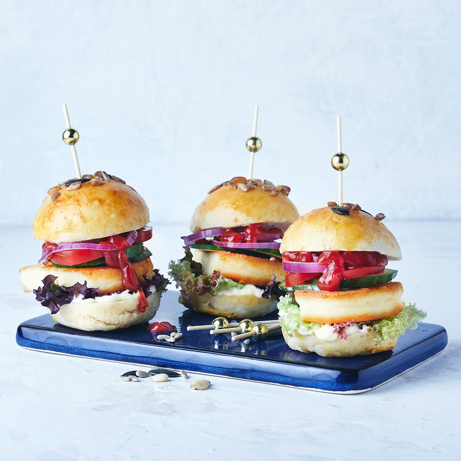 - Den Grillkäse nach Packungsanweisung in der Pfanne zubereiten und anschließend in 12 kleine Stücke schneiden. Die frischen Brötchen aus dem Ofen nehmen, auskühlen lassen und vor dem Servieren waagerecht halbieren.