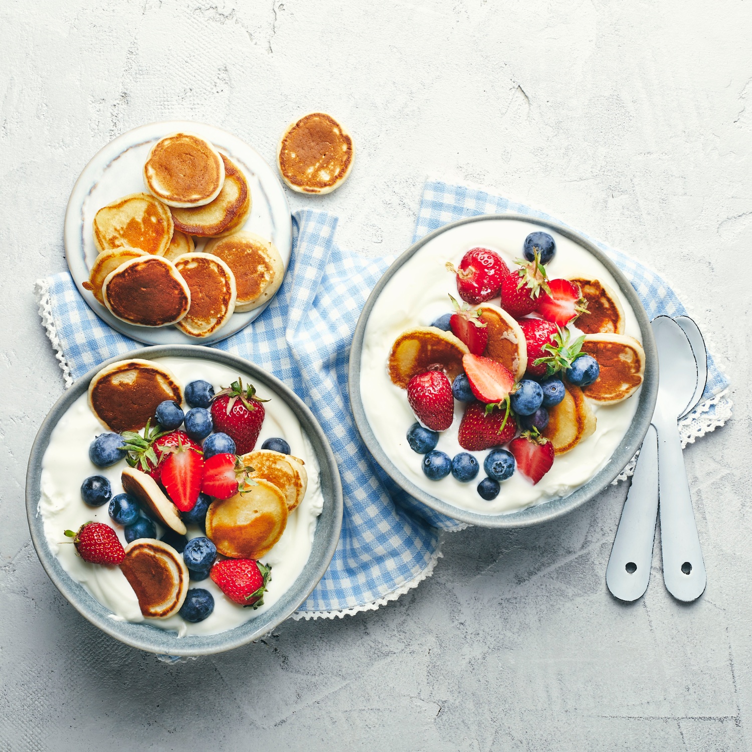 Pancakes, so klein, dass sie wie Cerealien in der Schüssel gegessen werden. Die Mini-Pancake-Bowl mit saisonalem Obst ist ein Frühstückstrend für besondere Tage. Zum Rezept