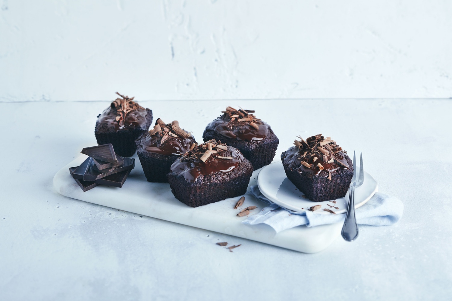 - Die restliche Kuvertüre im Wasserbad schmelzen, die ausgekühlten Mini-Schokokuchen damit bestreichen und mit Schokoladenraspeln bestreuen.