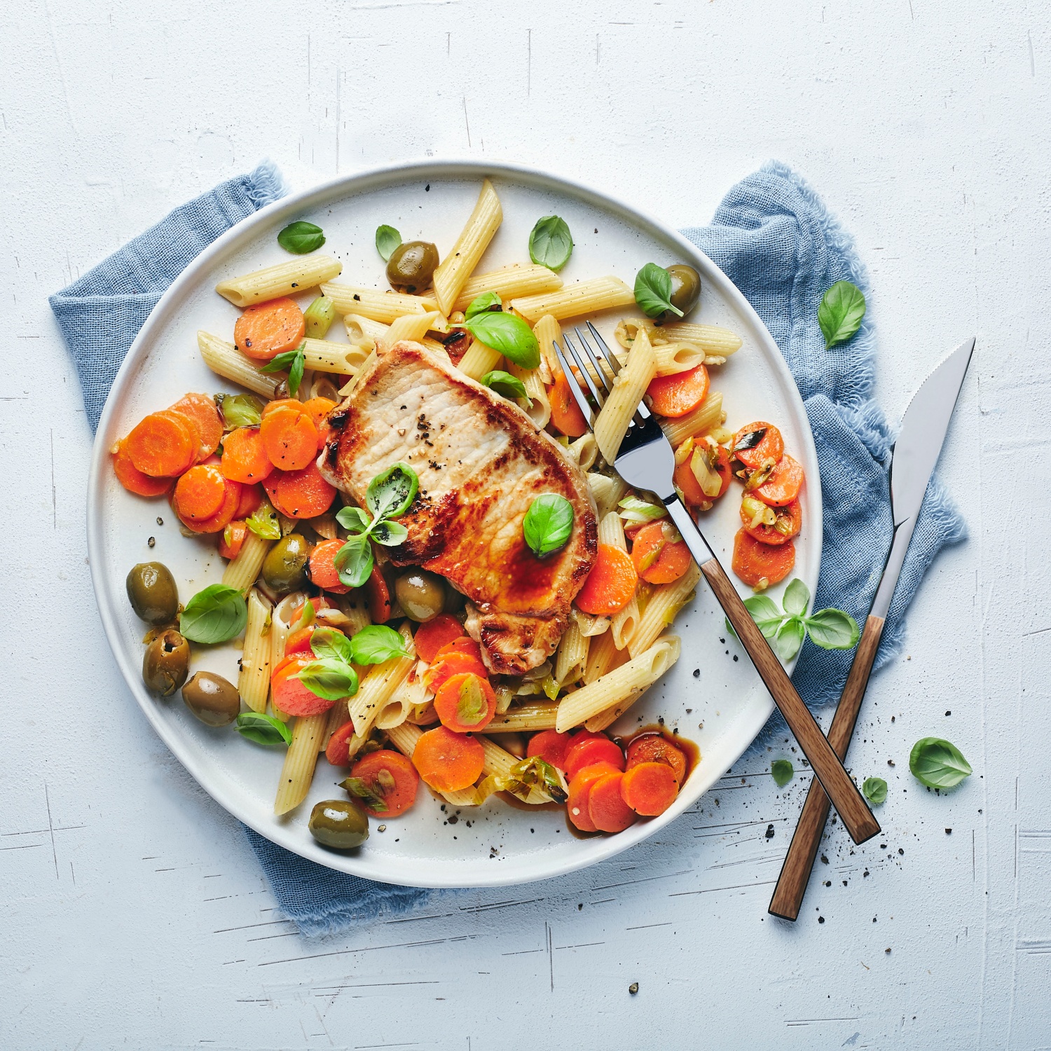 - Die fertig gekochten Nudeln abtropfen lassen und zum Pfannengemüse geben. Mit Salz, Pfeffer und etwas Zitronensaft (frisch gepresst) abschmecken, durchschwenken und mit Basilikum bestreuen. Die Gemüse-Nudel-Pfanne zusammen mit den Minutensteaks anrichten.