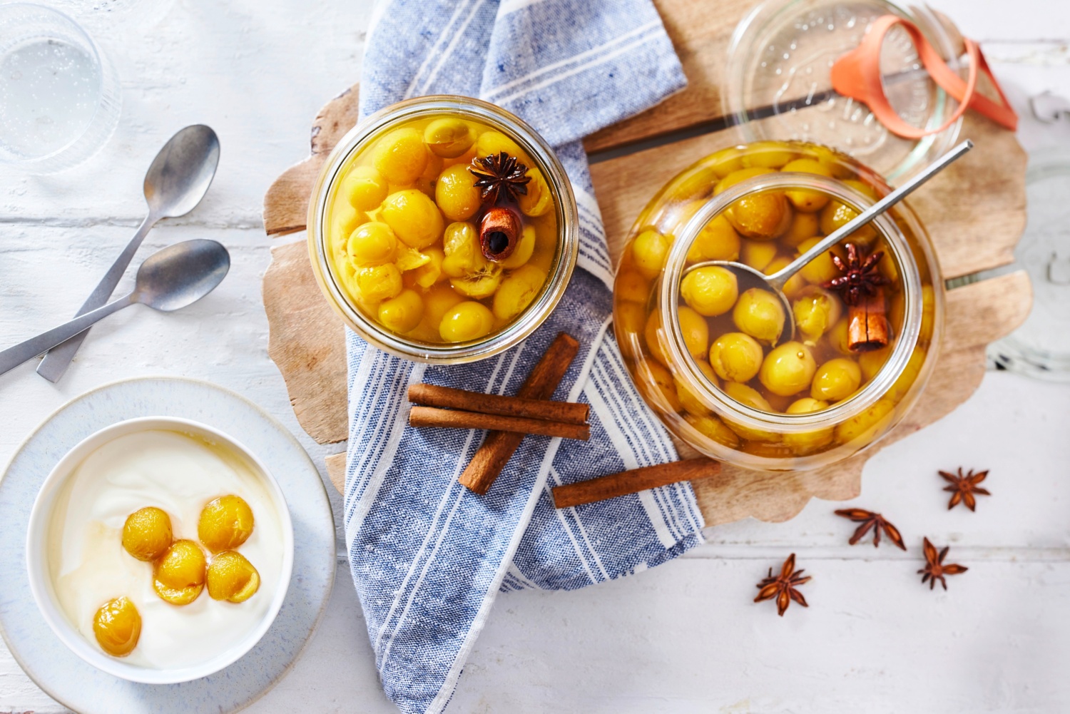 - Mirabellen mit Sud, bis ca. 2 cm unter den Glasrand (Sternanis und Zimtstangen auf die Gläser verteilen) in die vorbereiteten Gläser (z. B. Twist-off-Einmachgläser) verteilen und sofort verschließen.