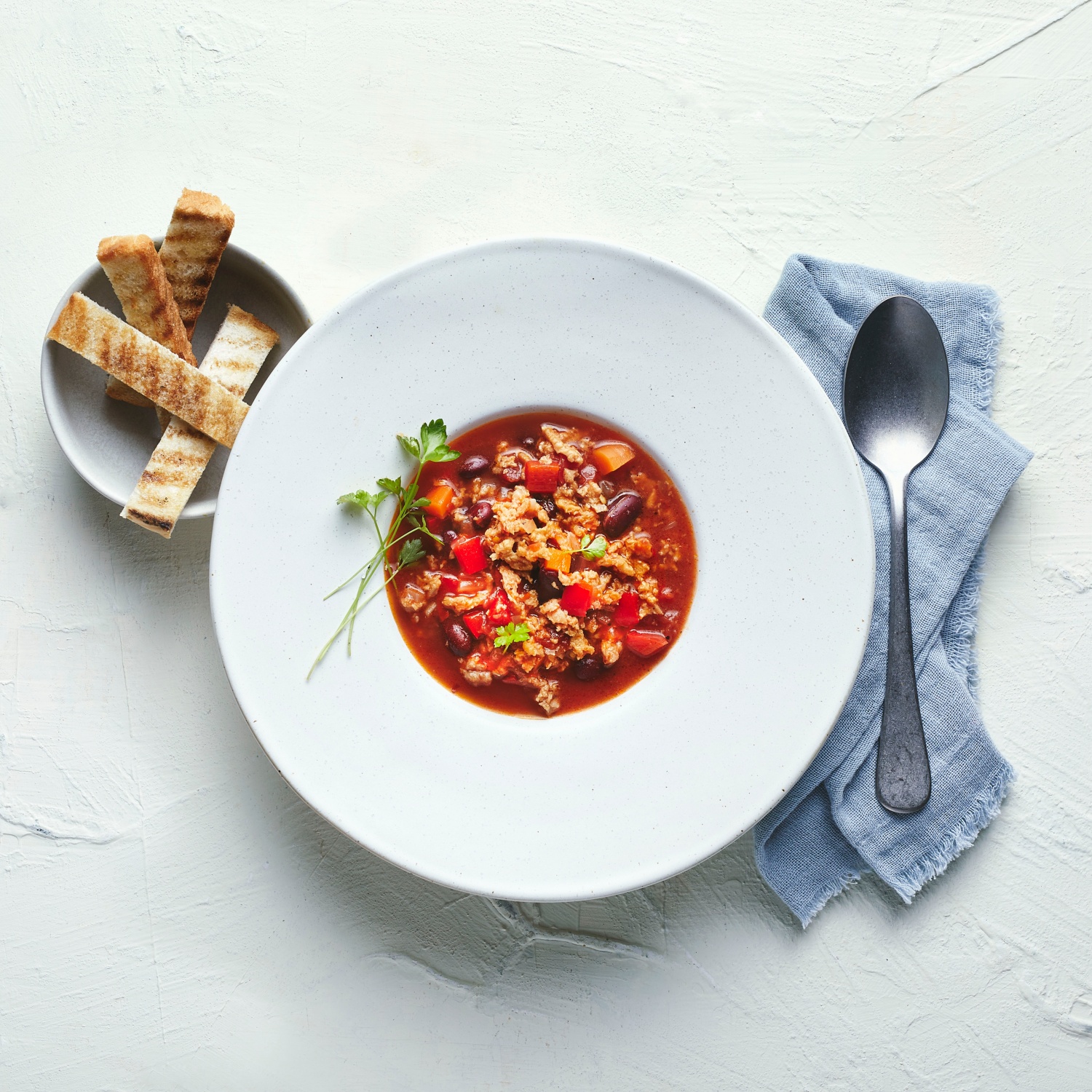 - Die Zwiebeln und den Knoblauch in einem großen Topf mit Olivenöl andünsten. Die Paprikawürfel und die Möhrenwürfel ca. 5 Minuten mitdünsten. Das Soja-Geschnetzelte hinzufügen. Mit der restlichen und aufgefangenen Brühe (insgesamt ca. 1 l), den gehackten Tomaten und den Kidneybohnen ablöschen und 20 Minuten köcheln lassen. Das Tomatenmark unterrühren. Mit Chilisalz, Pfeffer und Paprikapulver kräftig würzen.