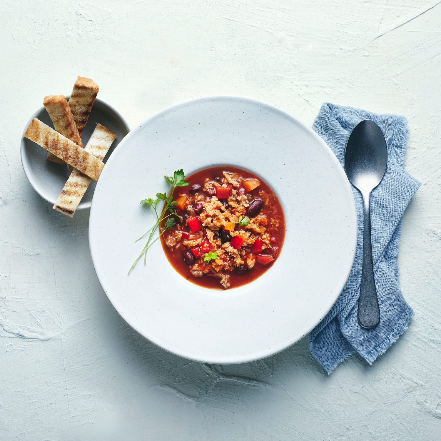 - Die Zwiebeln und den Knoblauch in einem großen Topf mit Olivenöl andünsten. Die Paprikawürfel und die Möhrenwürfel ca. 5 Minuten mitdünsten. Das Soja-Geschnetzelte hinzufügen. Mit der restlichen und aufgefangenen Brühe (insgesamt ca. 1 l), den gehackten Tomaten und den Kidneybohnen ablöschen und 20 Minuten köcheln lassen. Das Tomatenmark unterrühren. Mit Chili-Salz, Pfeffer und Paprikapulver kräftig würzen.
