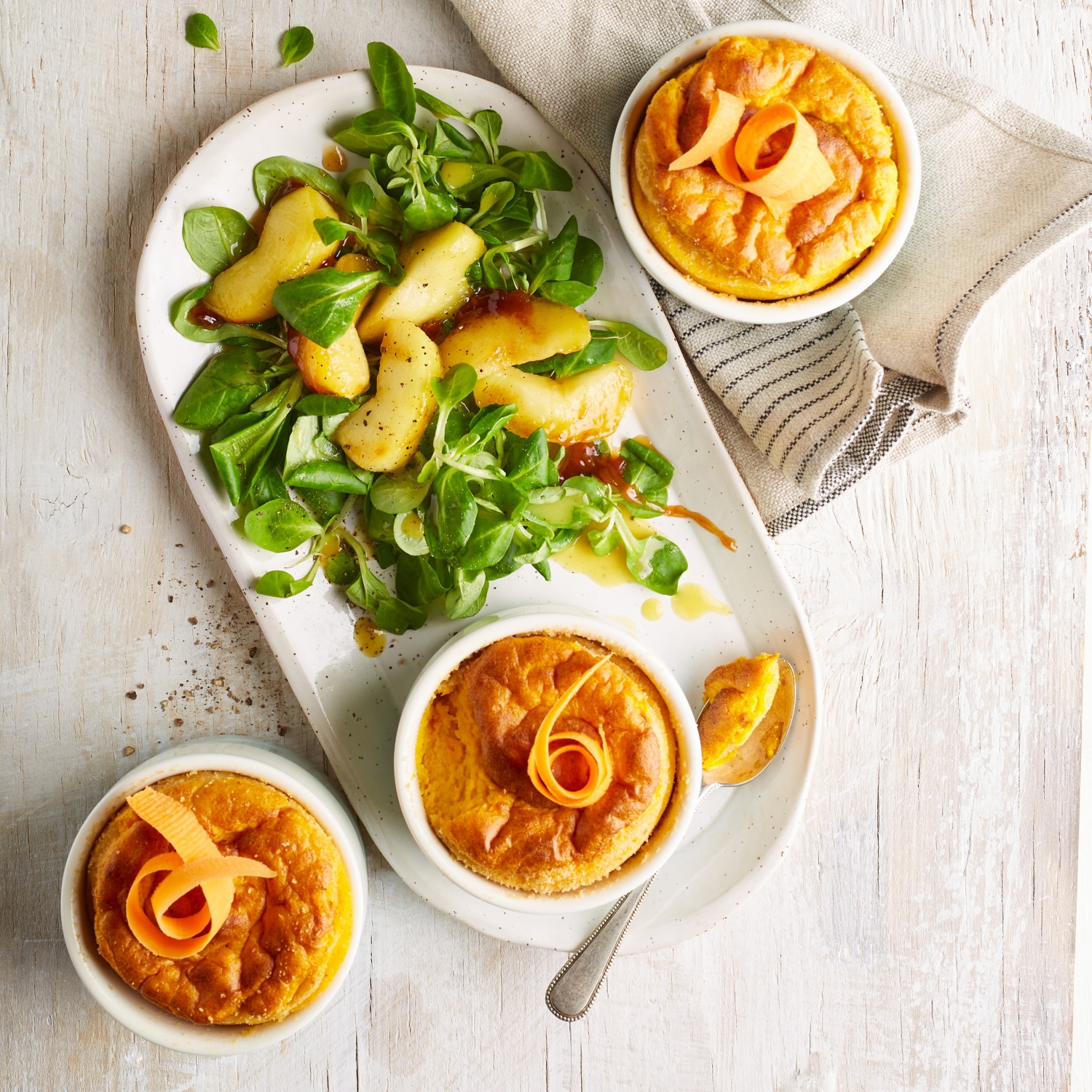 Kleines Glück aus dem Ofen: Fluffiges Möhren-Soufflé und frischer Feldsalat mit Honig-Vinaigrette. Zum Rezept