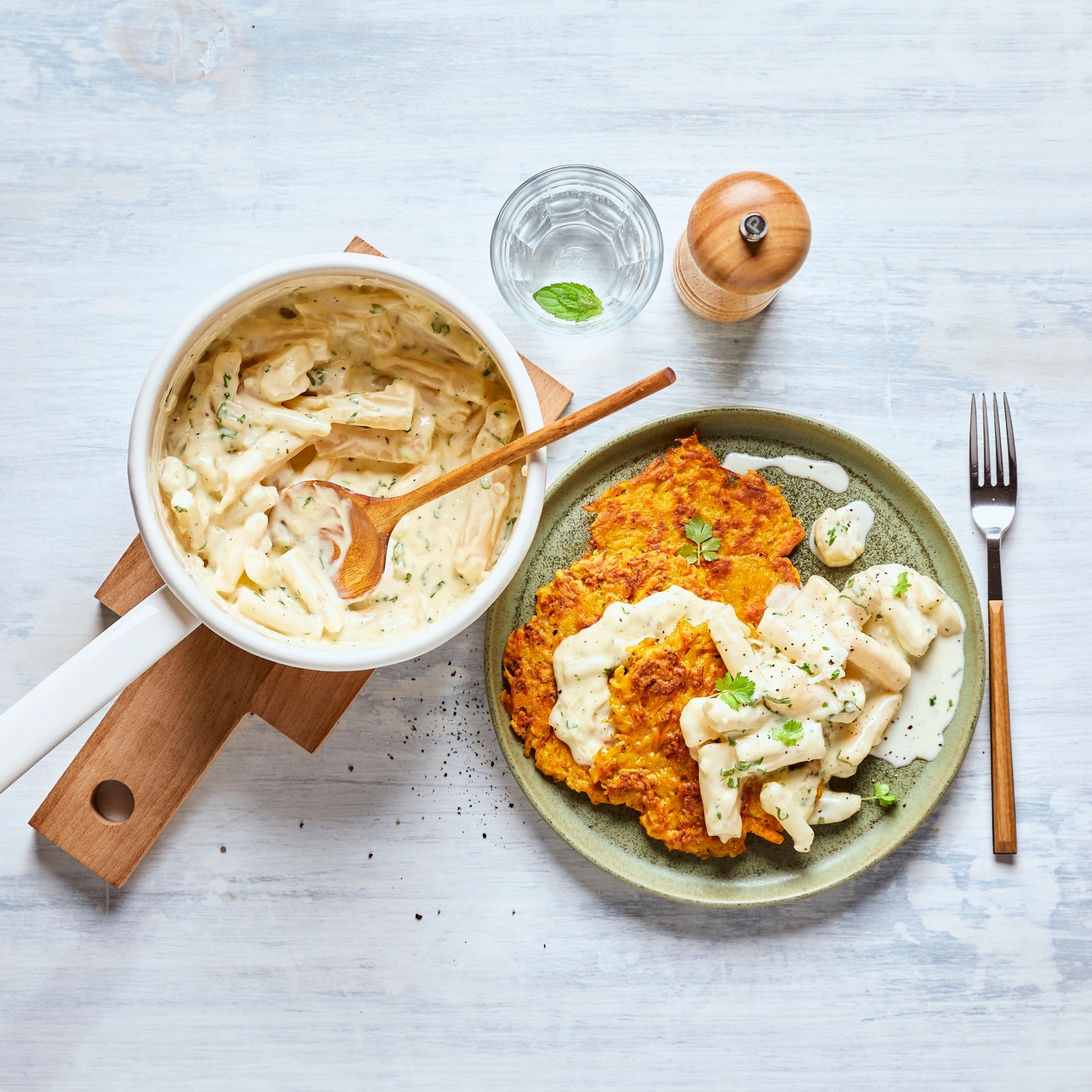 Geriebene Möhren in aromatischem Ragout. Die Möhrenrösti mit Schwarzwurzelragout sind ein schnelles, würziges Gericht. Zum Rezept