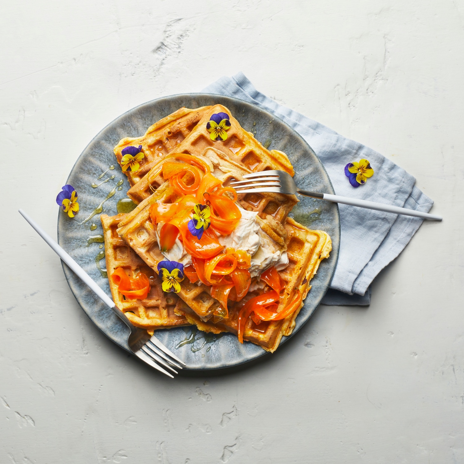 Möhrenwaffeln mit Buttermilch und karamellisierten Möhrenstreifen