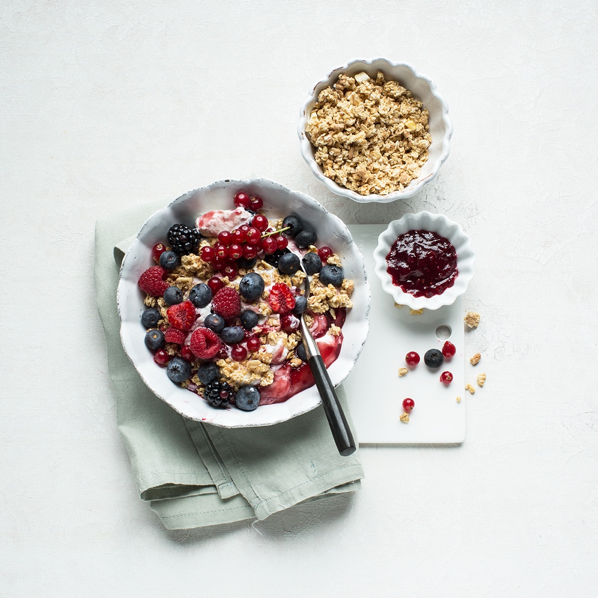 - Die Himbeeren und die Heidelbeeren waschen, trockentupfen und mit dem Müsli auf der Bowl verteilen.
