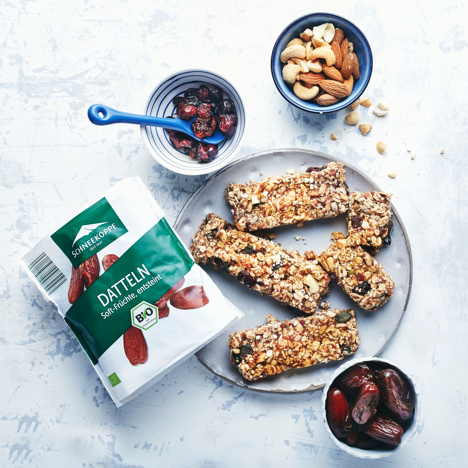 - Die Haferflocken-Müsli-Nuss-Mischung und das Dattelmus zugeben. Alles gut miteinander verkneten. Die Masse ggf. mit Gewürzen oder Trockenfrüchten verfeinern.