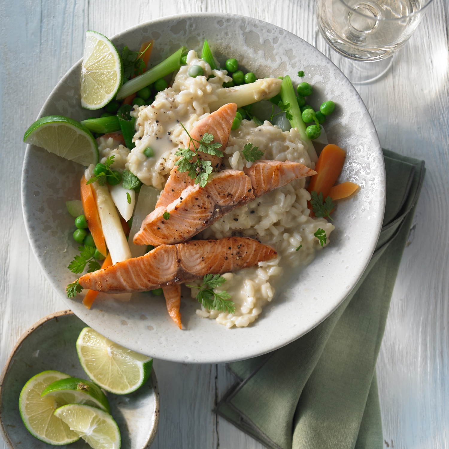 - Das Risotto auf Tellern anrichten, die Lachsstreifen darauf verteilen, mit Limettenecken und Kräuterzweigen garnieren, das Frühlingsgemüse daneben anrichten und alles servieren.