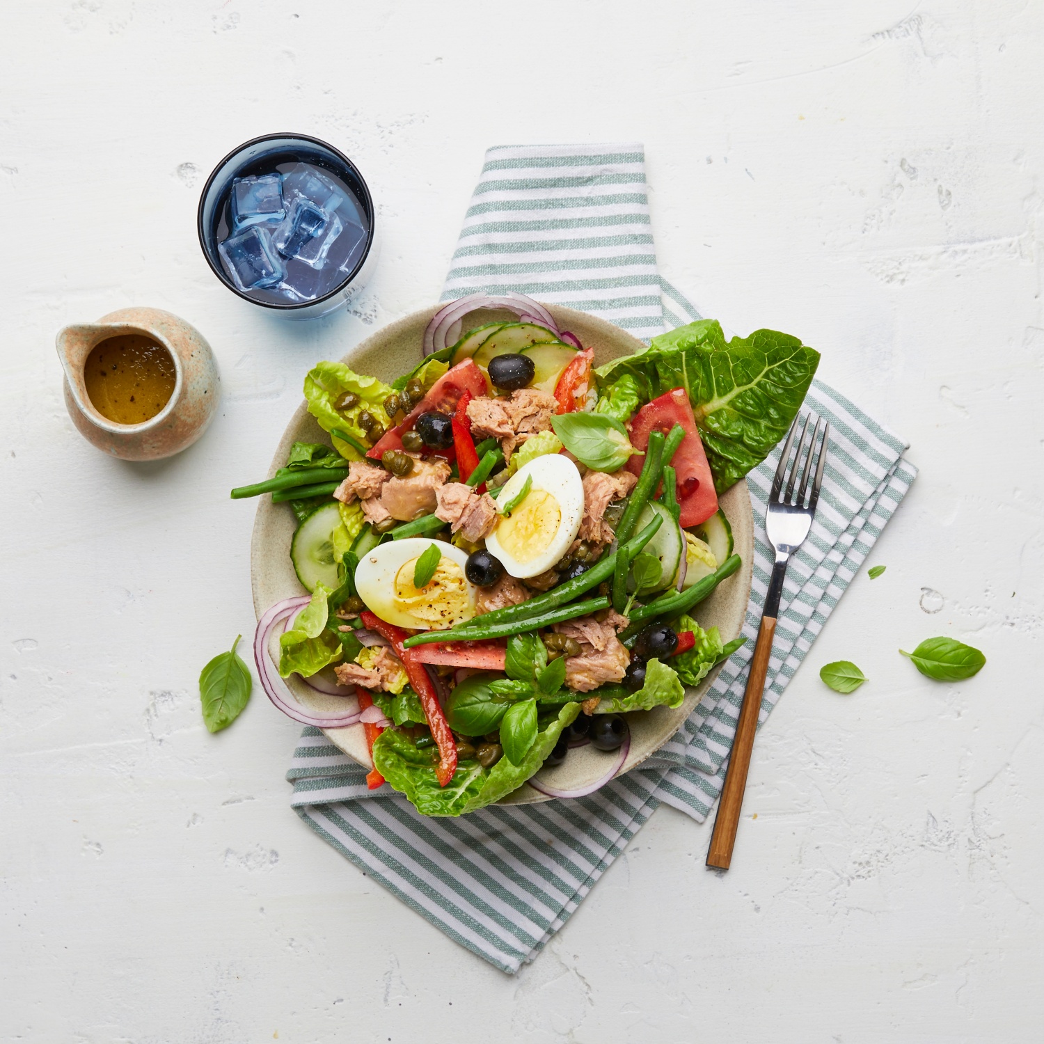 - Den Salat in einer Schüssel verteilen. Tomaten, Gurkenscheiben, Zwiebel, Paprika, grüne Bohnen und den Thunfisch darauf anrichten. Die abgekühlten und geschälten Eier halbieren und auf den Salat legen. Die Oliven und Kapern gleichmäßig auf dem Nizza-Salat verteilen. Das Dressing dazu reichen.