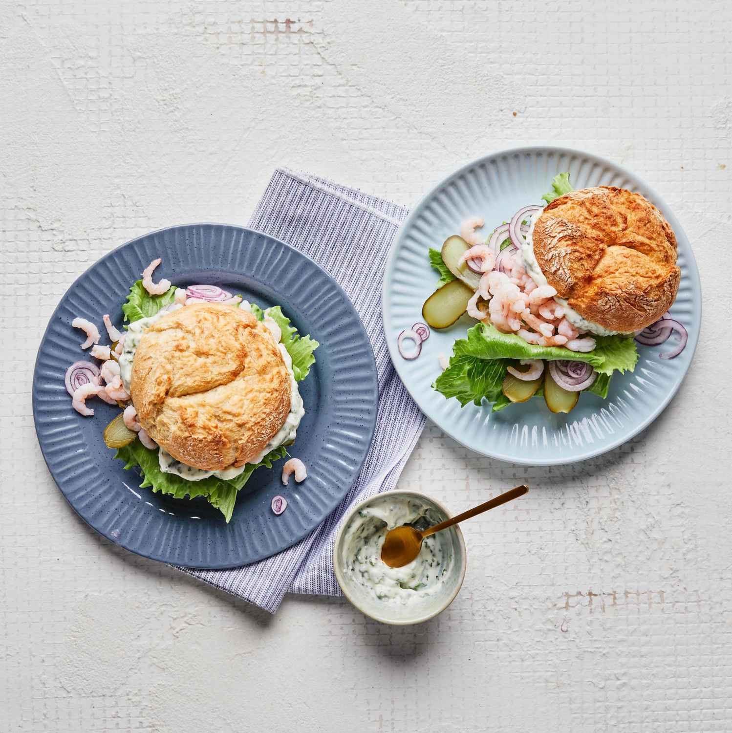 - Die Brötchen aufschneiden und mit der Remoulade bestreichen. Den Salat, die Krabben, die Zwiebelringe und die Gurken darauflegen und zuklappen.