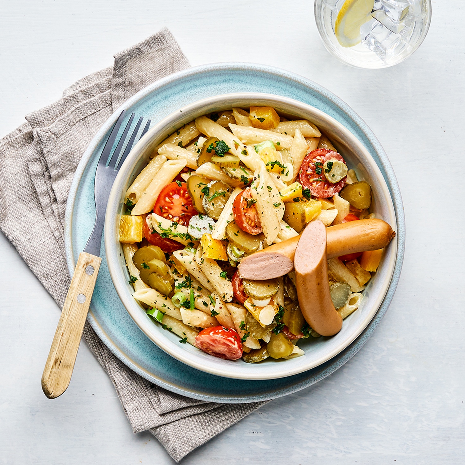 - Den Nudelsalat mit Gemüse nochmals abschmecken und mit den Wiener Würstchen servieren.