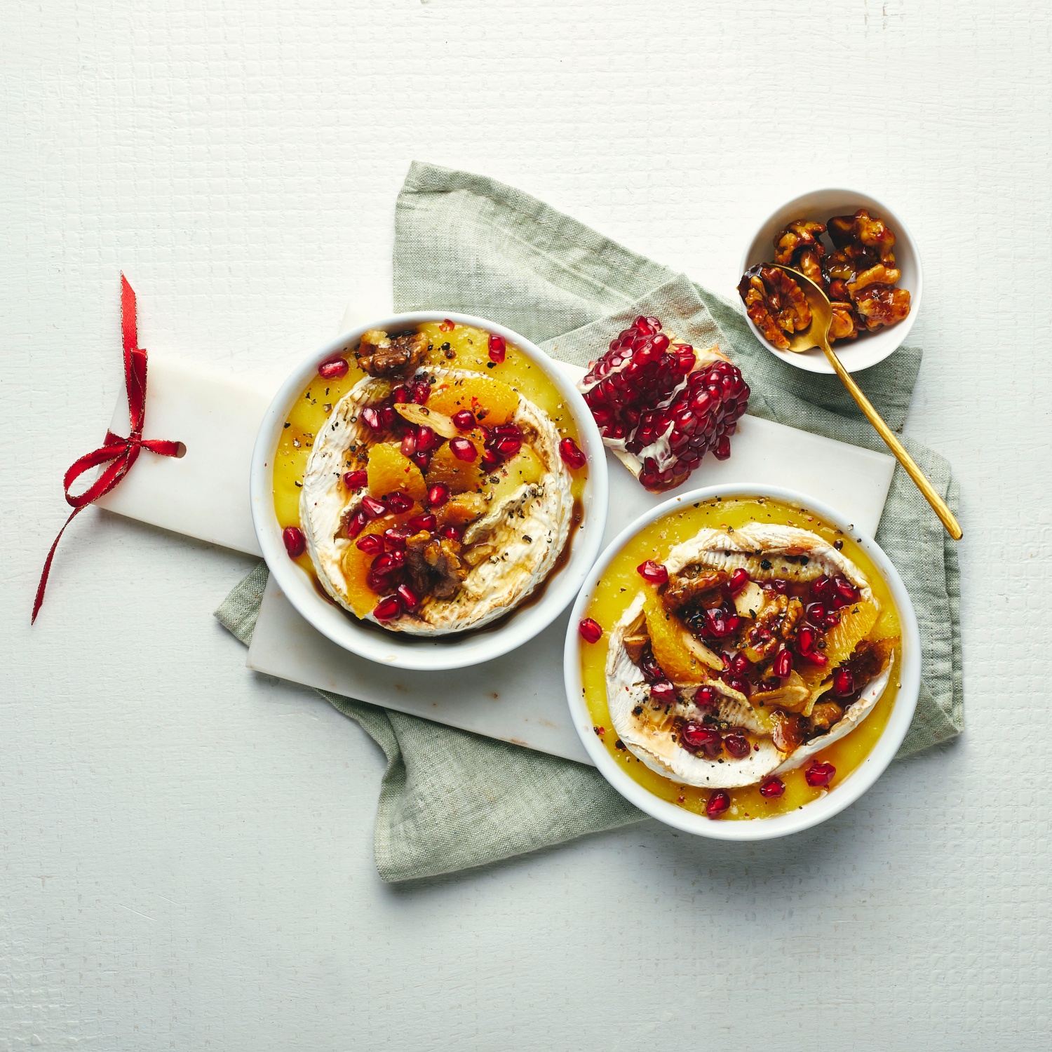 - Die gebackenen Camemberts mit den karamellisierten Walnüssen, den Orangenfilets und den Granatapfelkernen garnieren und servieren.