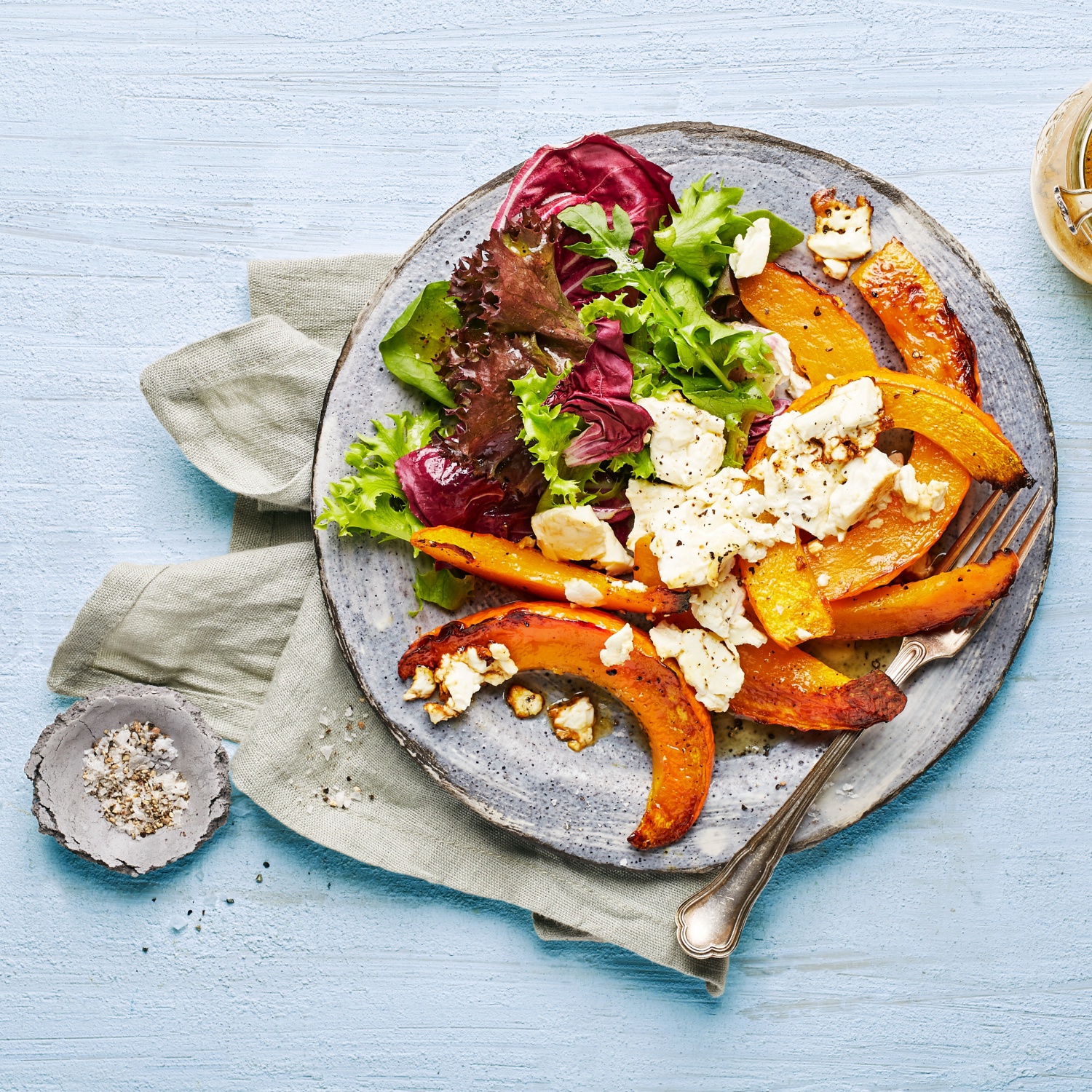 - Salat mit der restlichen Marinade mischen und zusammen mit den gebackenen Kürbisspalten anrichten.