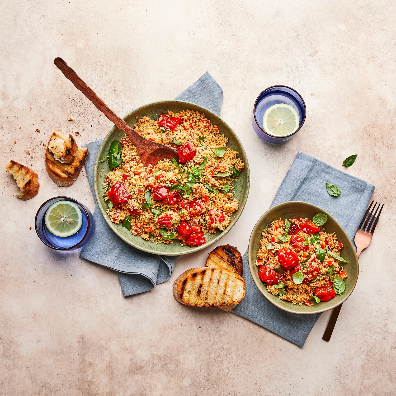 - Die Ofentomaten und das Zwiebel-Paprika-Gemisch zum Couscous geben und vorsichtig vermengen. Mit Salz, Pfeffer und Paprikapulver abschmecken. Das Basilikum hacken und über die Ofentomaten mit dem Couscous geben.