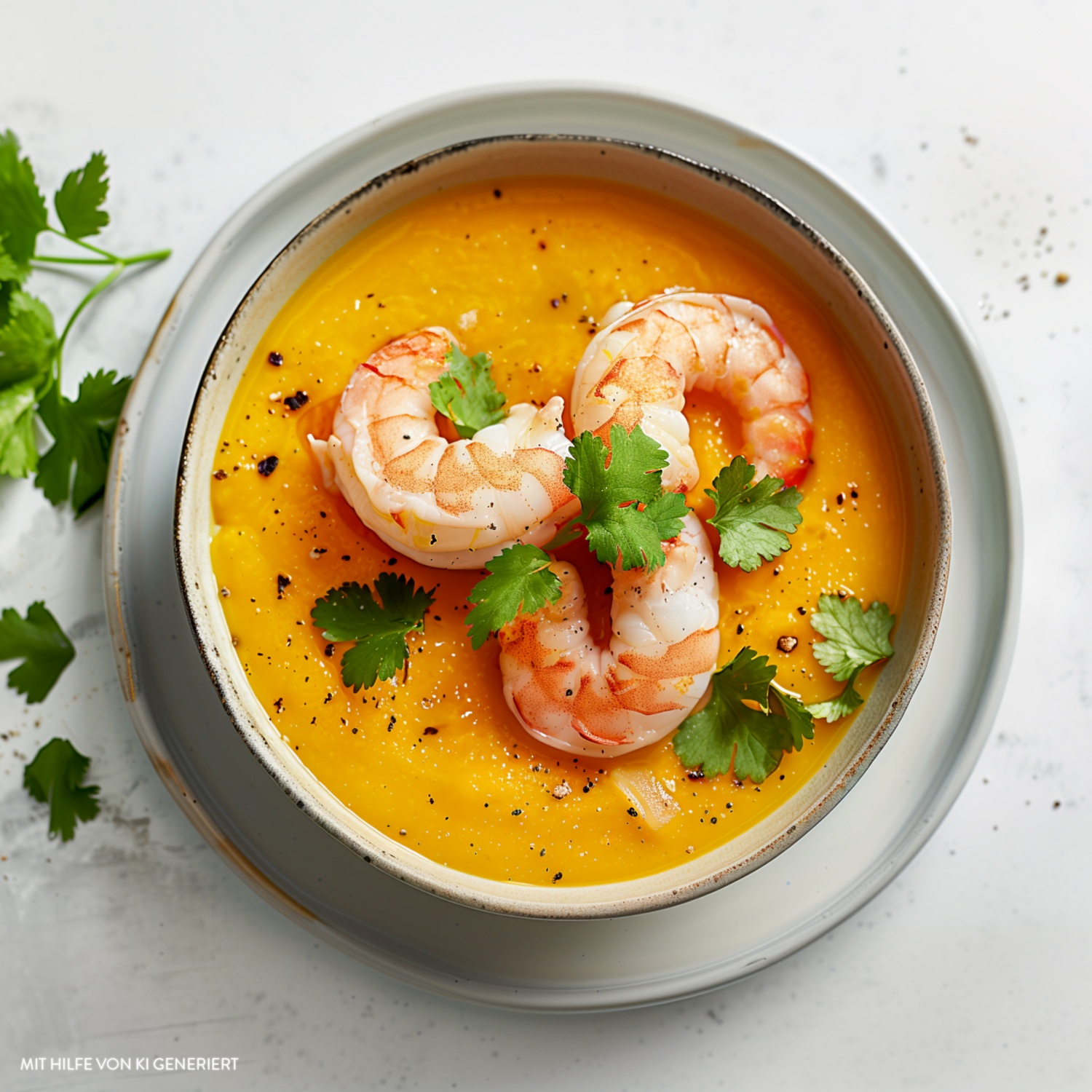 - Die Suppe in Schalen füllen und die Garnelen darauf verteilen. Mit Petersilie und frischem Pfeffer (optional) garnieren und servieren.