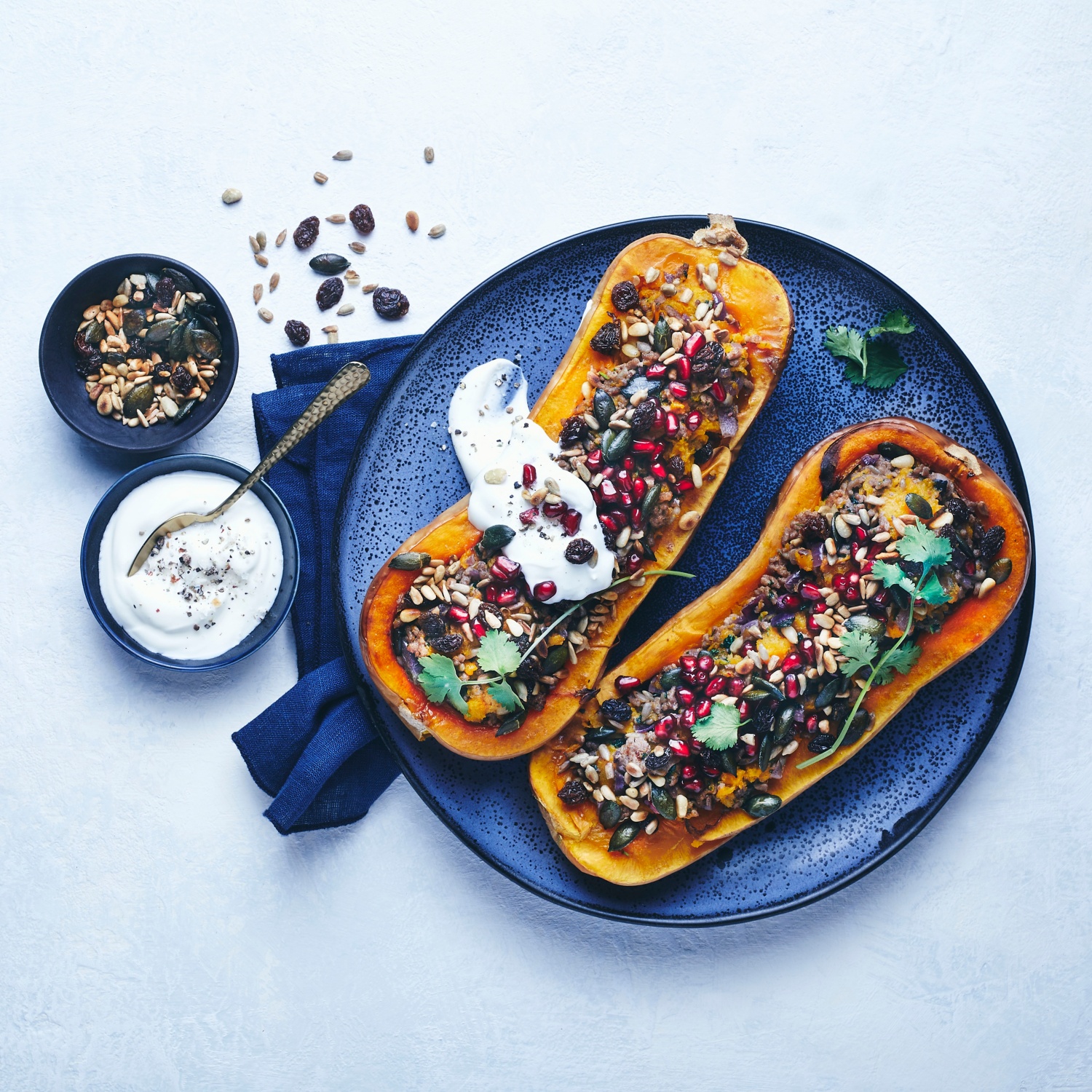 - Die Kürbishälften aus dem Ofen nehmen und mit dem Joghurt, den Granatapfelkernen, den Pinienkernen und den Kürbiskernen garnieren. Sofort servieren.