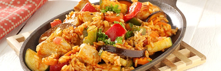- Tomaten enthäuten, in Stücke schneiden und mit dem Fleisch und der Petersilie zum Gemüse geben. Nochmals 10 Minuten garen, den fertigen Reis unterheben und durchziehen lassen. In einer großen Schüssel servieren.