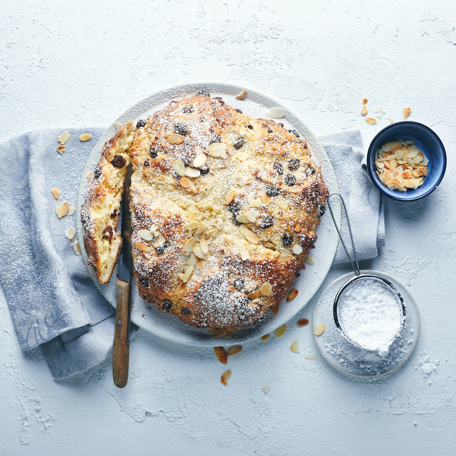 - Die Mandeln hacken und mit den Rosinen in den Teig kneten. Den Teig halbieren, einen runden Laib formen und auf ein mit Backpapier ausgelegtes Blech legen. Mit einer umgedrehten Schüssel abdecken und 20 Minuten ruhen lassen.