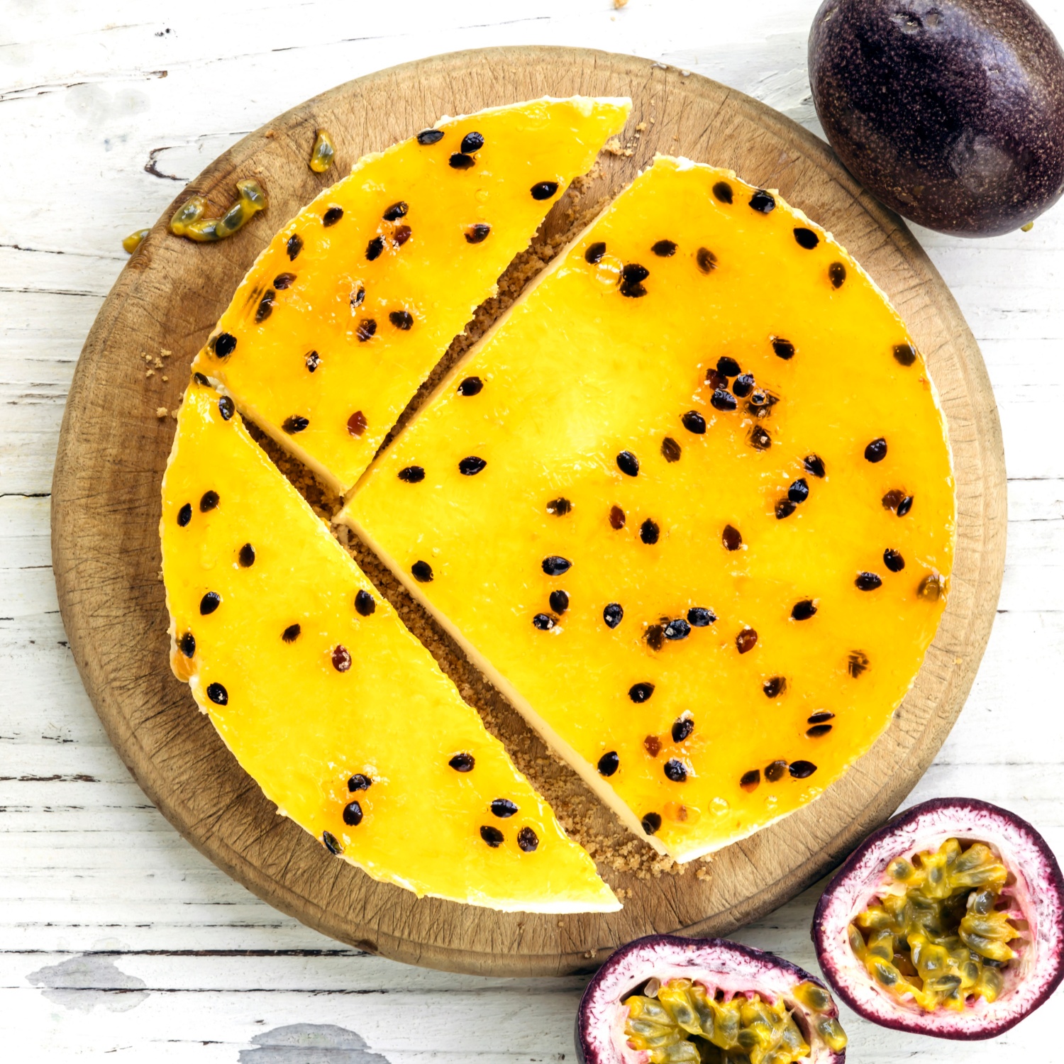 - Passionsfrüchte halbieren und das Fruchtfleisch mit einem Löffel herausschaben. Fruchtfleisch und Saft aufkochen lassen. Die Stärke mit etwas Wasser glatt rühren und in den Saft zum Andicken geben. Abkühlen lassen. Den Käsekuchen mit der Passionsfruchtcreme bestreichen.