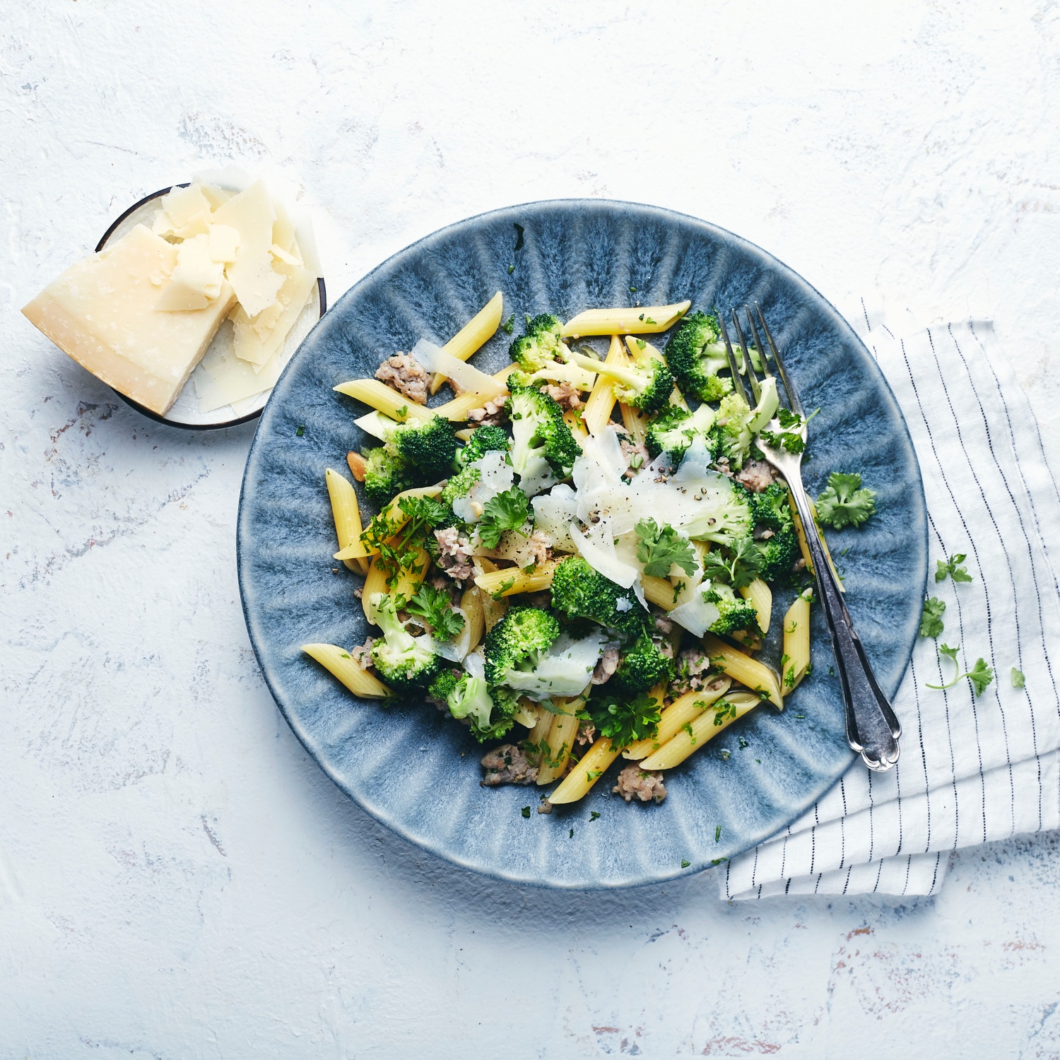 - Die Pasta Salsiccia mit Petersilie und frisch geriebenem Parmesan servieren.