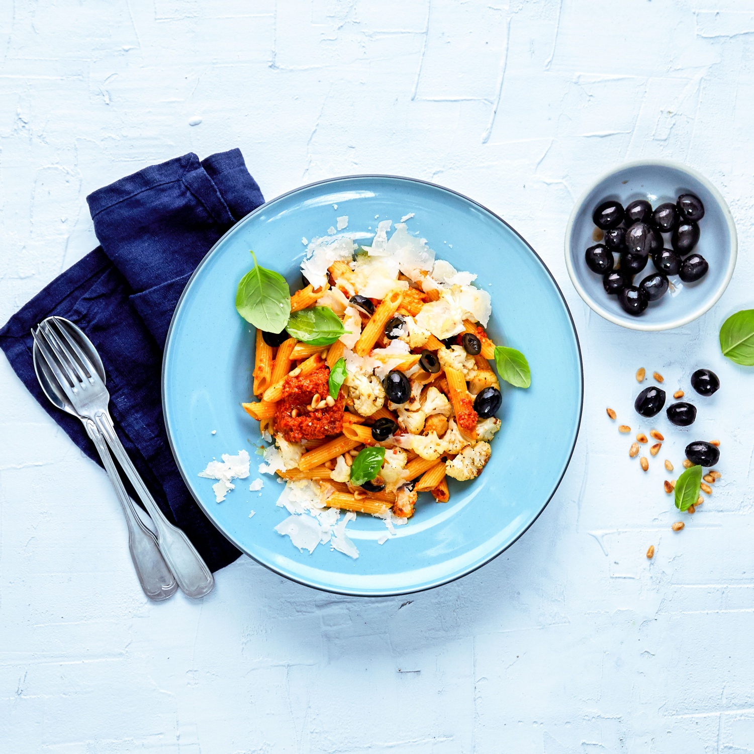 - Die Penne in Salzwasser al dente kochen und abtropfen lassen. Die Nudeln und den gerösteten Blumenkohl mit dem Pesto mischen. Die Oliven in Scheiben schneiden und dazugeben. Mit frischem Parmesan bestreut servieren.