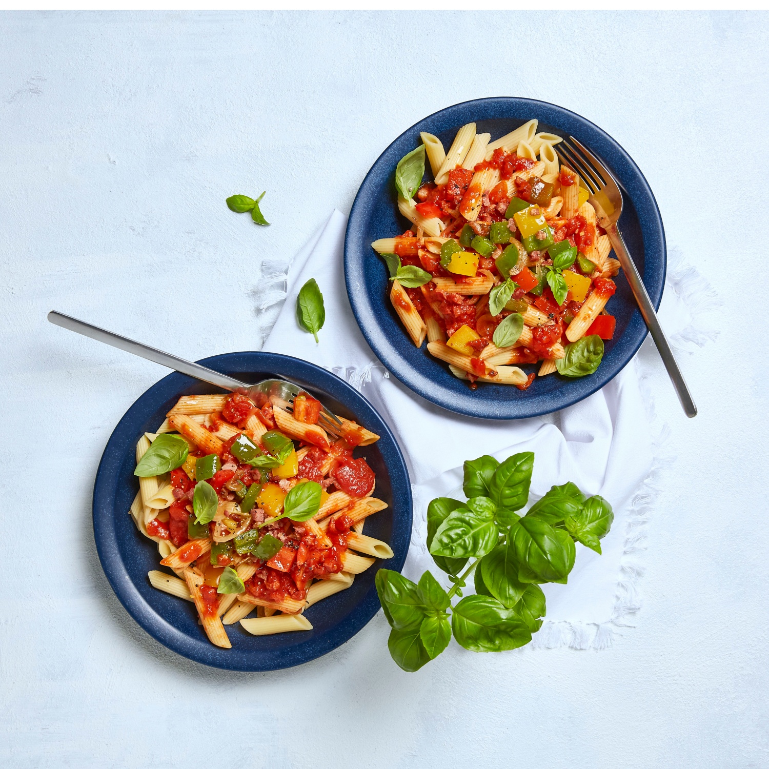 - Zwischenzeitlich Penne in Salzwasser bissfest kochen. Basilikum in Streifen schneiden. Nudeln mit Sauce anrichten und mit dem Basilikum bestreuen.